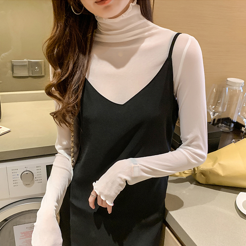 黑色长袖t恤女秋季款网纱拼接木耳边高领上衣简约基础内搭打底衫
