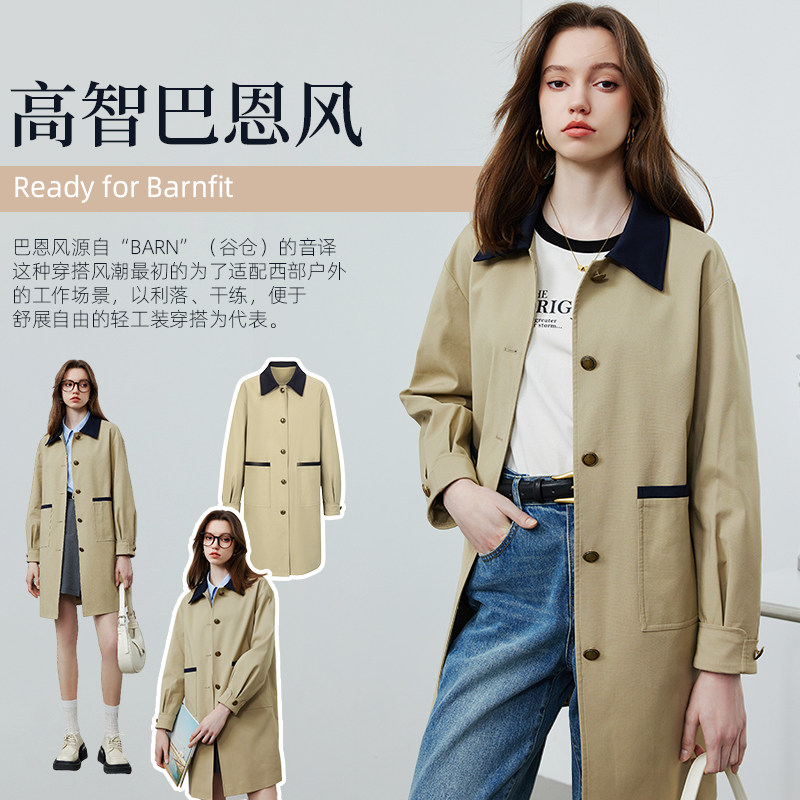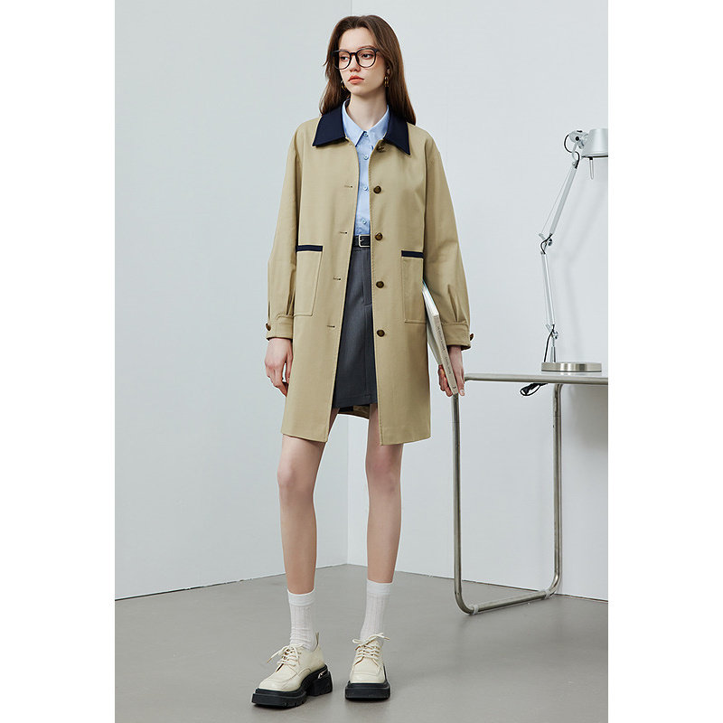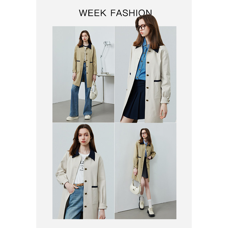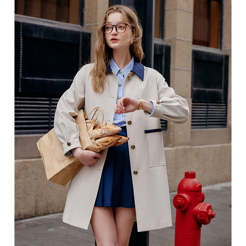 KBNE巴恩风白色风衣中长外套女日系2025秋季新款撞色气质长袖上衣