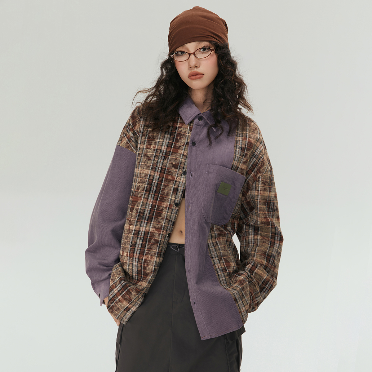 Eptison2023秋季新品拼接复古灯芯绒拼接格子衬衫宽松设计感衬衣