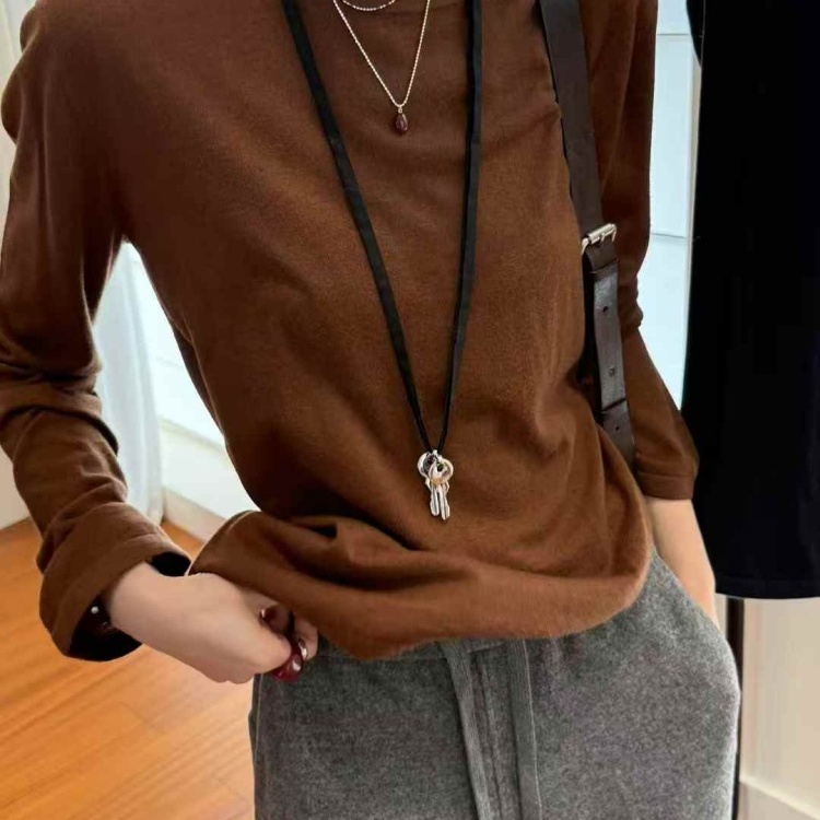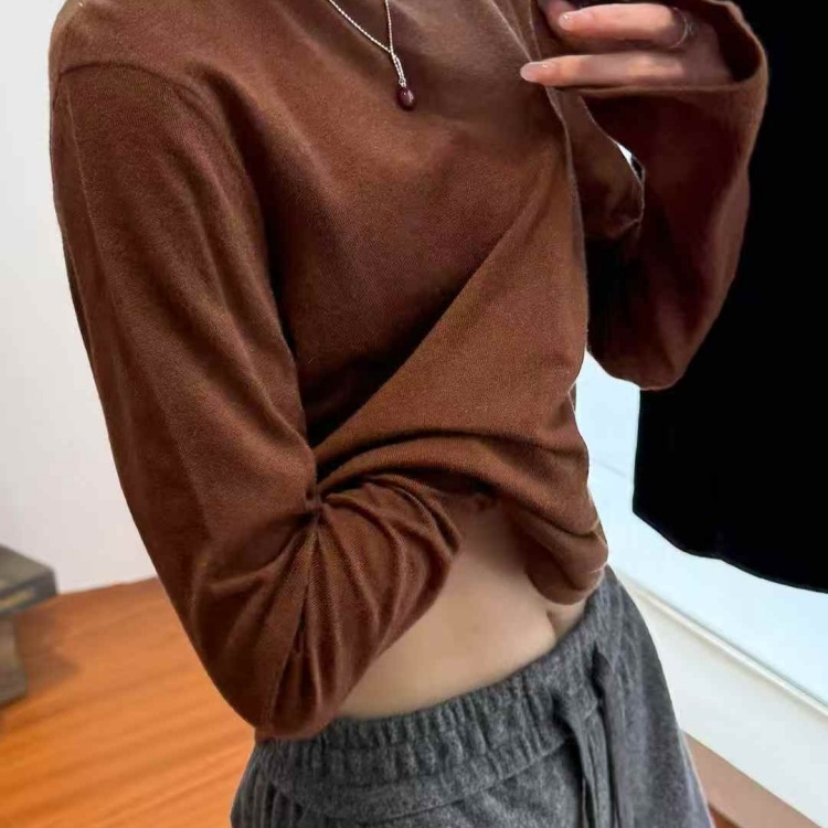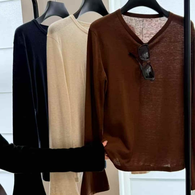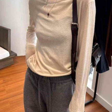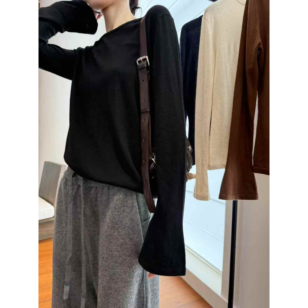 欧洲站2025秋季新款欧货极简纯色圆领后坑条蚕丝羊绒针织打底衫女