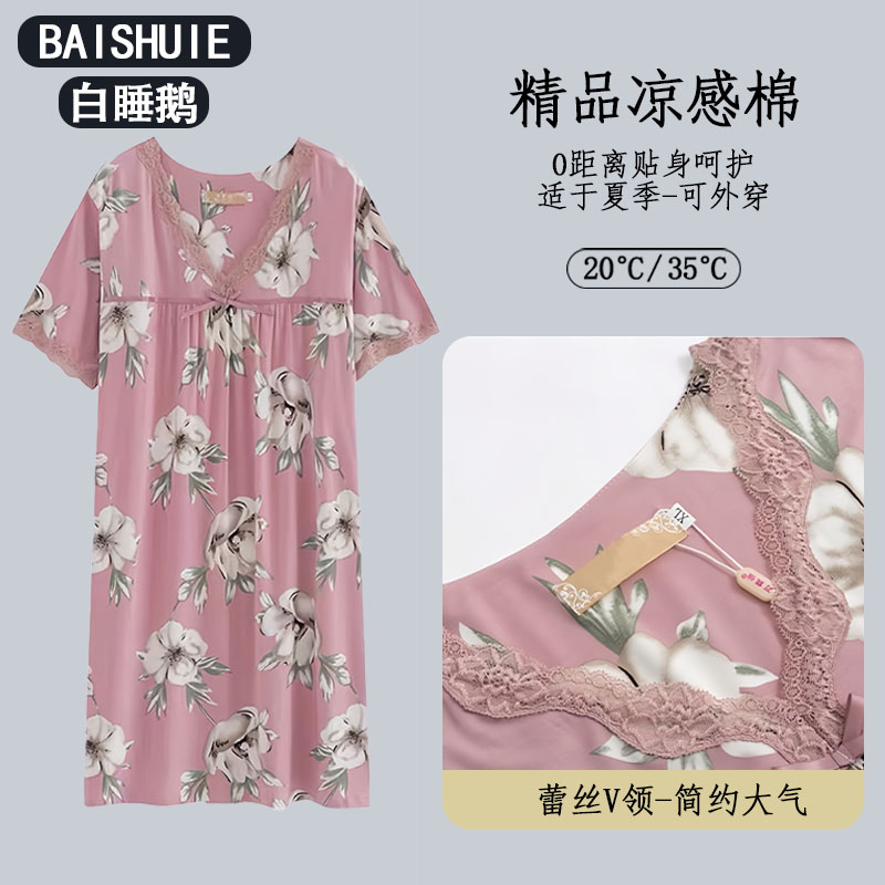 睡衣女士夏季莫代尔短袖睡裙女夏天连衣裙加肥加大薄款妈妈家居服