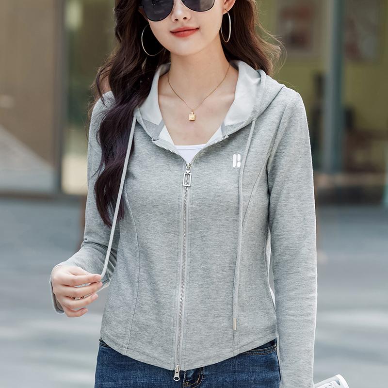 连帽拉链短款外套女春秋新款设计感开衫长袖T恤女打底衫运动上衣