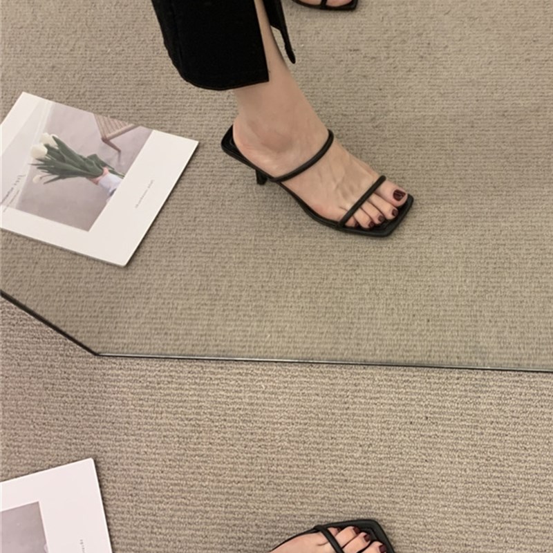 香港一字带方头细跟拖鞋女2025新款外穿露趾细带简约显瘦高跟凉鞋