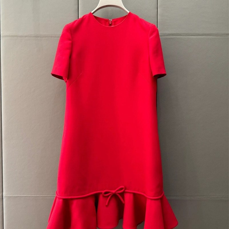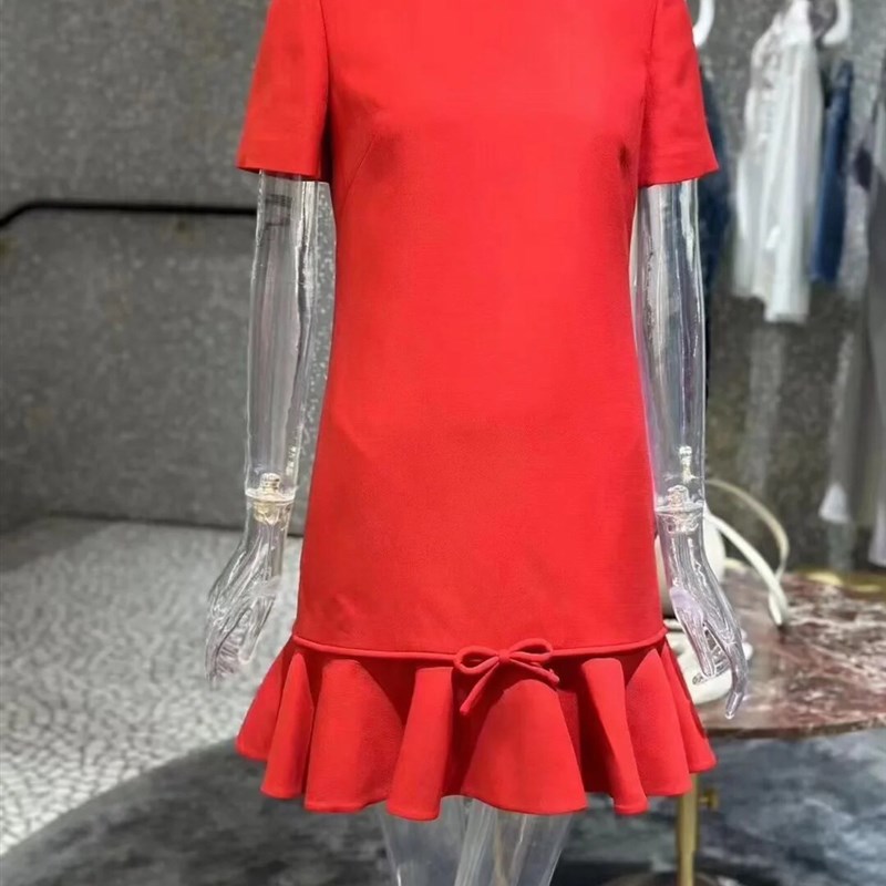 优雅的鱼尾宽松圆领褶边红色连衣裙2024夏季褶边蝴蝶结连衣裙