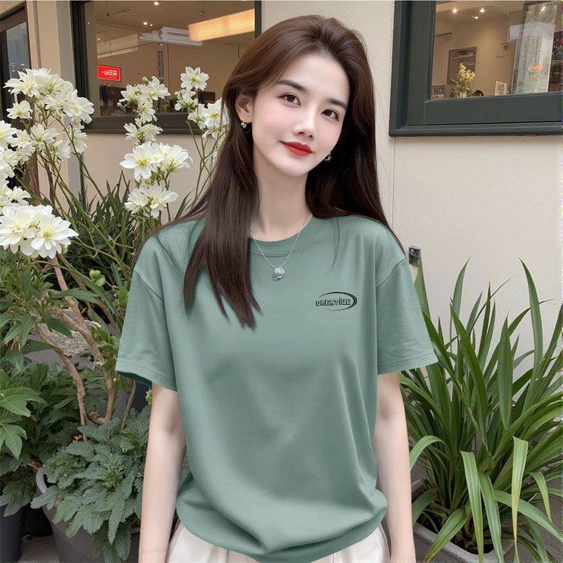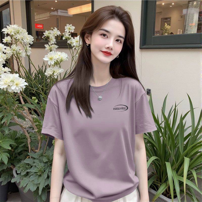 夏季纯棉皮粉色短袖休闲T恤女时尚通勤百搭韩版宽松显瘦圆领上衣