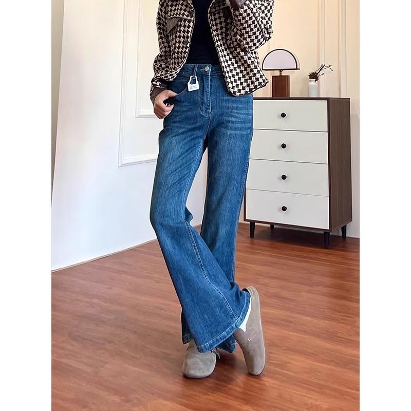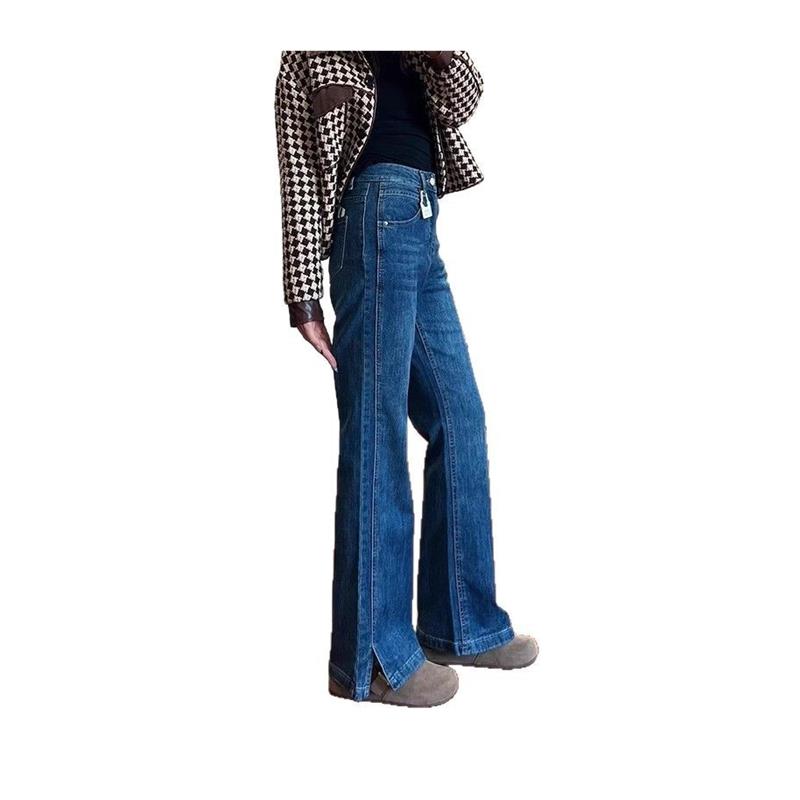 深蓝色开叉微喇牛仔裤女潮流百搭大码修身显瘦高腰弹力喇叭长裤子