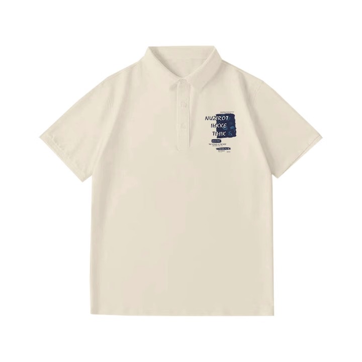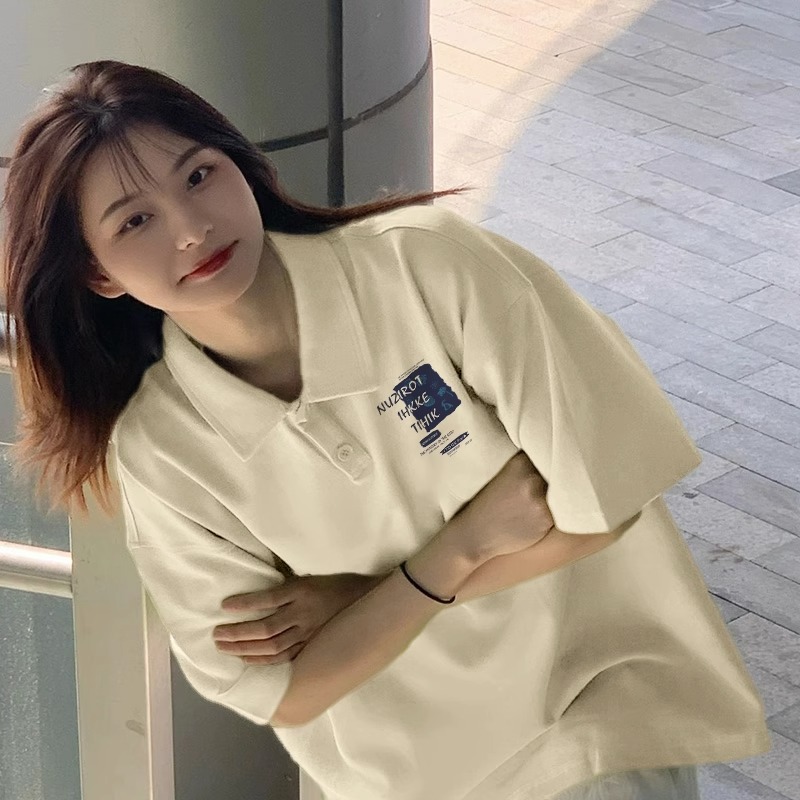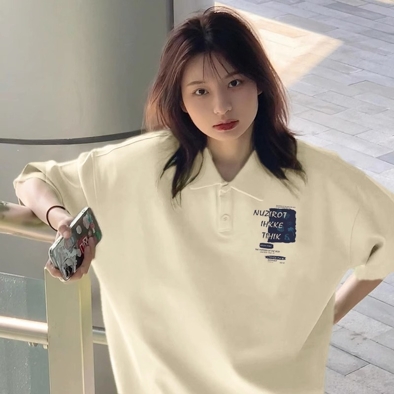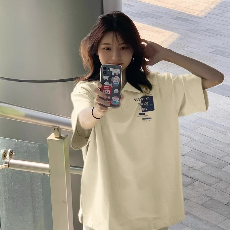 纯棉美式杏色Polo领短袖t恤女夏季宽松日系复古艺术生翻领上衣潮