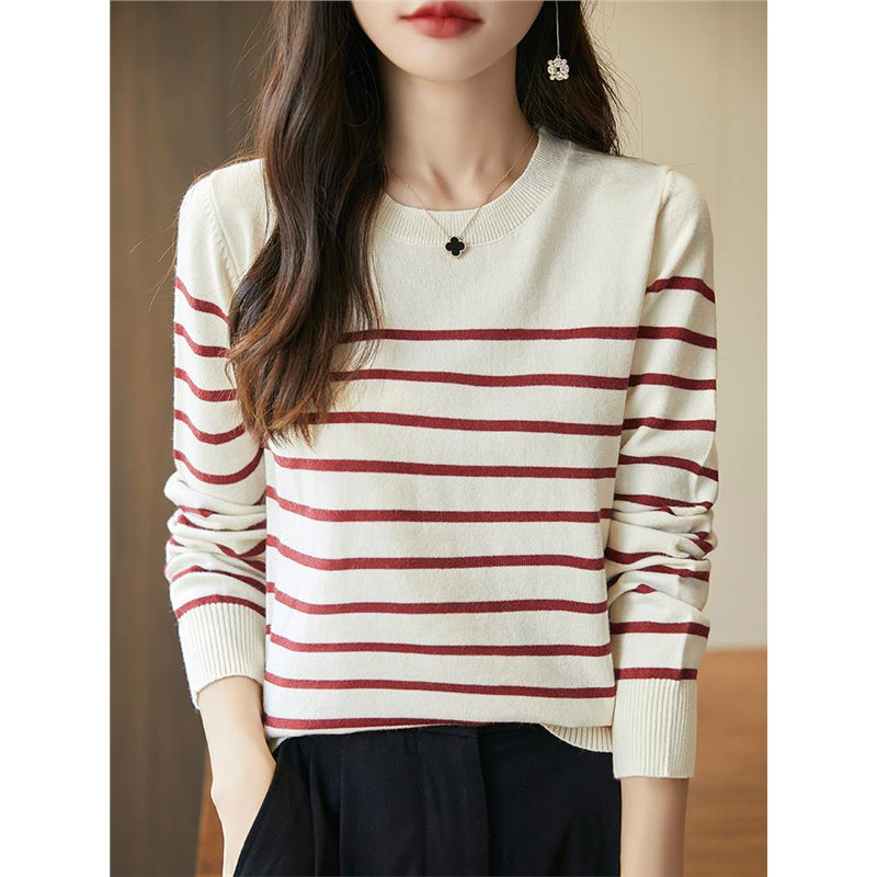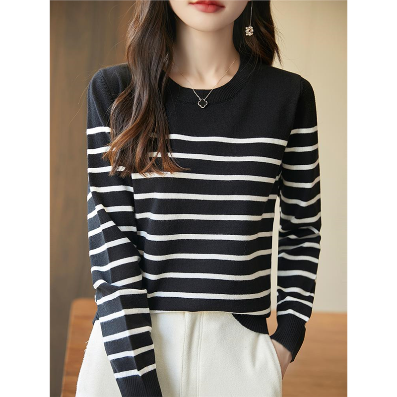 黑白条纹长袖针织打底衫女圆领套头复古设计感小众百搭减龄毛衣新