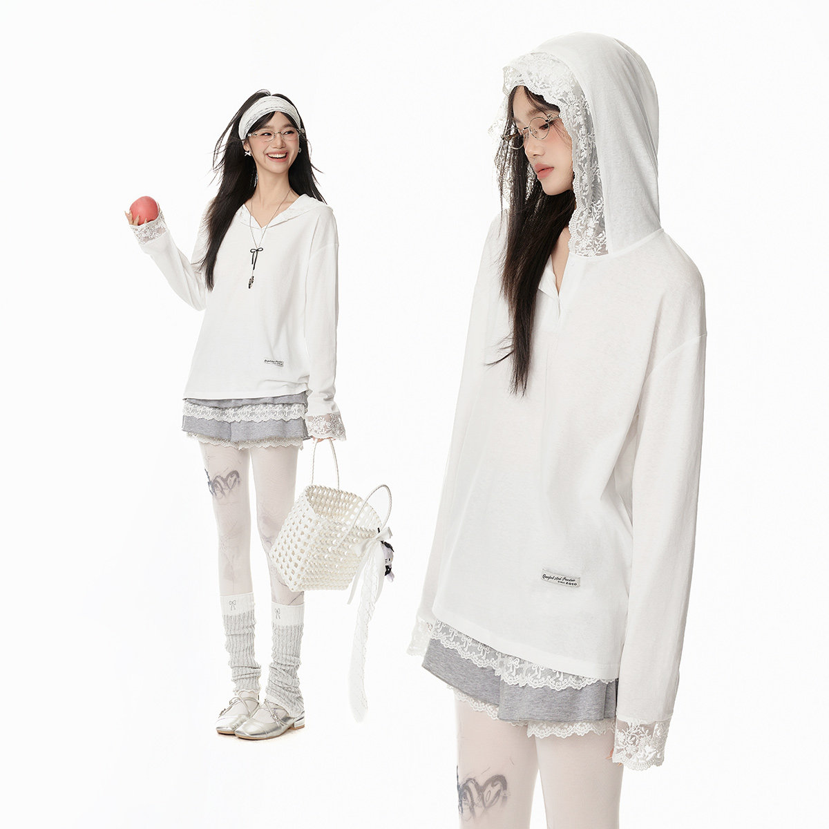 EPTISON淡人穿搭长袖T恤女2025年春夏新款宽松蕾丝花边少女风上衣
