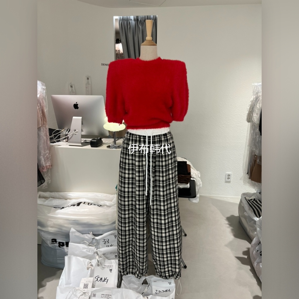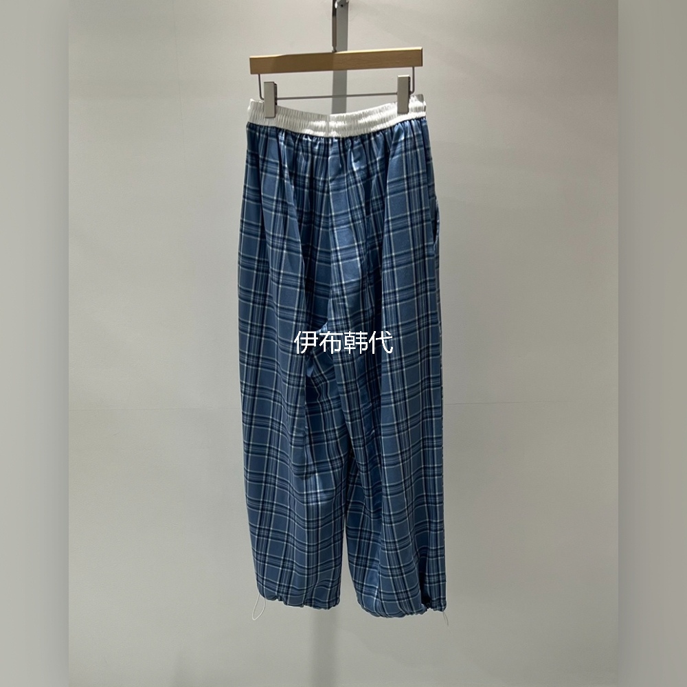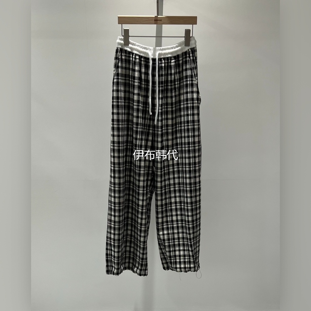 DENISE 韩国东大门正品代购25冬款 松紧腰裤脚抽绳格子休闲长裤