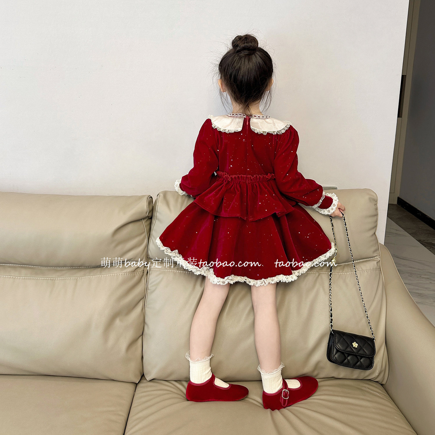 原创童装女童丝绒闪闪加绒连衣裙2025秋冬新款女孩蝴蝶结领公主裙