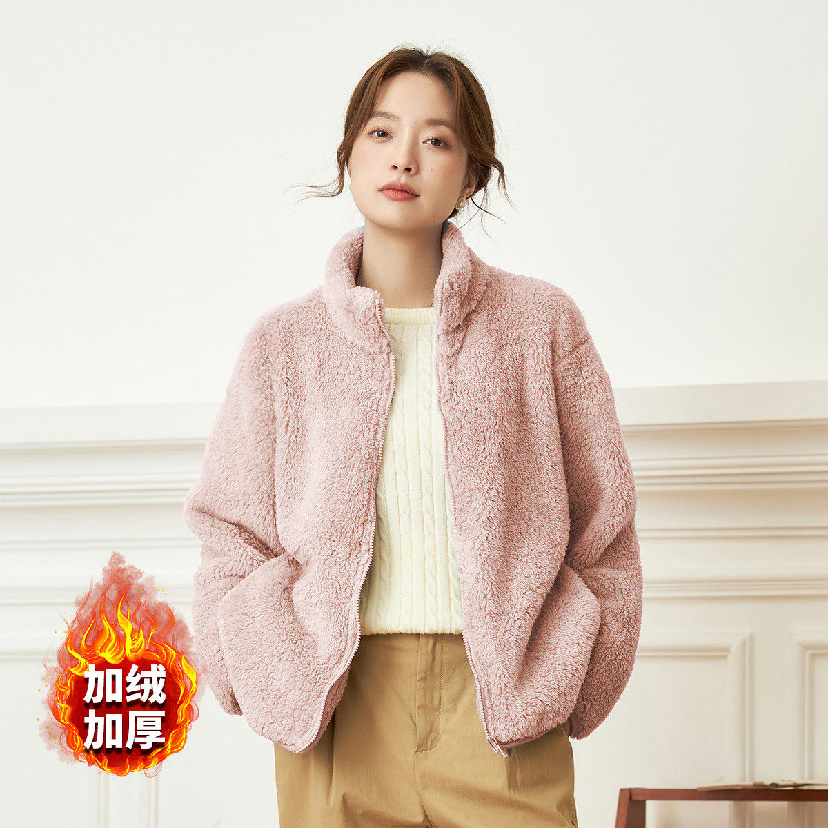 茵曼2025冬季新款加绒加厚保暖仿羊羔绒外套女保暖休闲宽松上衣