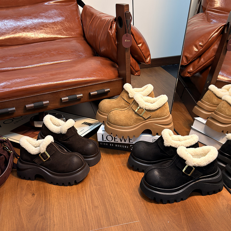 冬季小个子厚底增高加绒乐福鞋复古松糕小皮鞋女绒面圆头德比鞋子