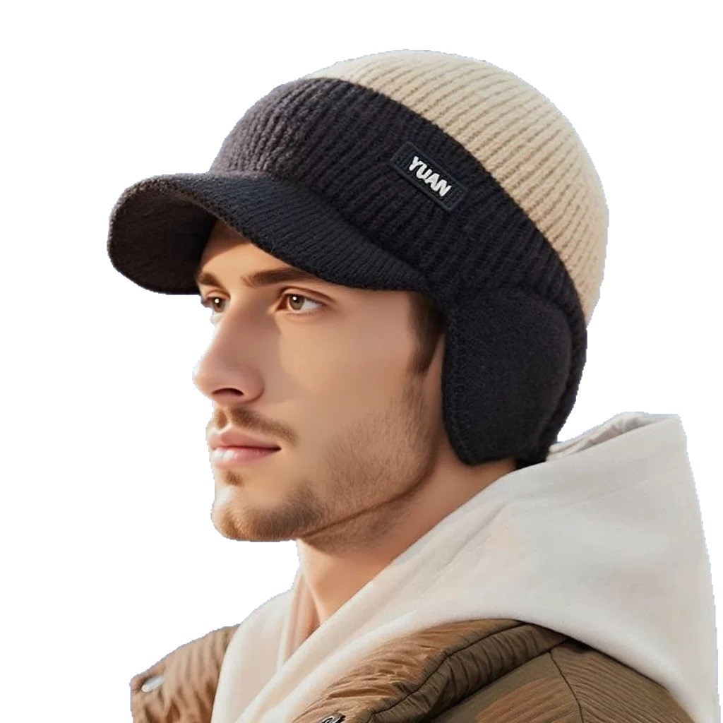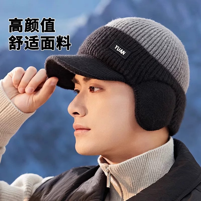 跨境冬季针织鸭舌帽男士加绒加厚护耳毛线帽骑行防风防寒套头男帽