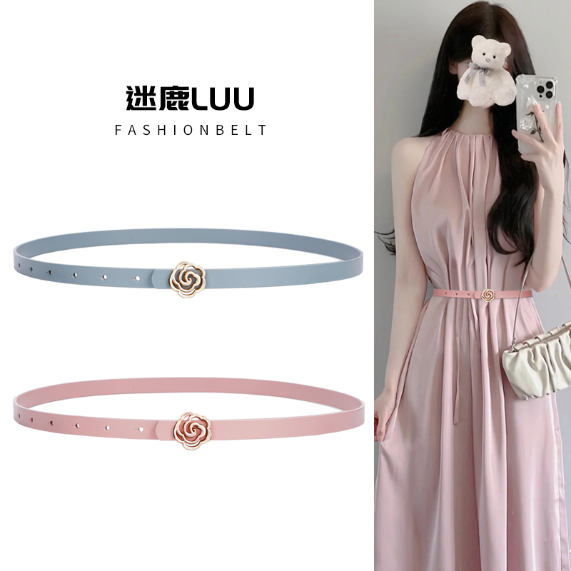 蓝色真皮腰带女百搭装饰配连衣裙子粉色紫色白色皮带夏季复古配饰