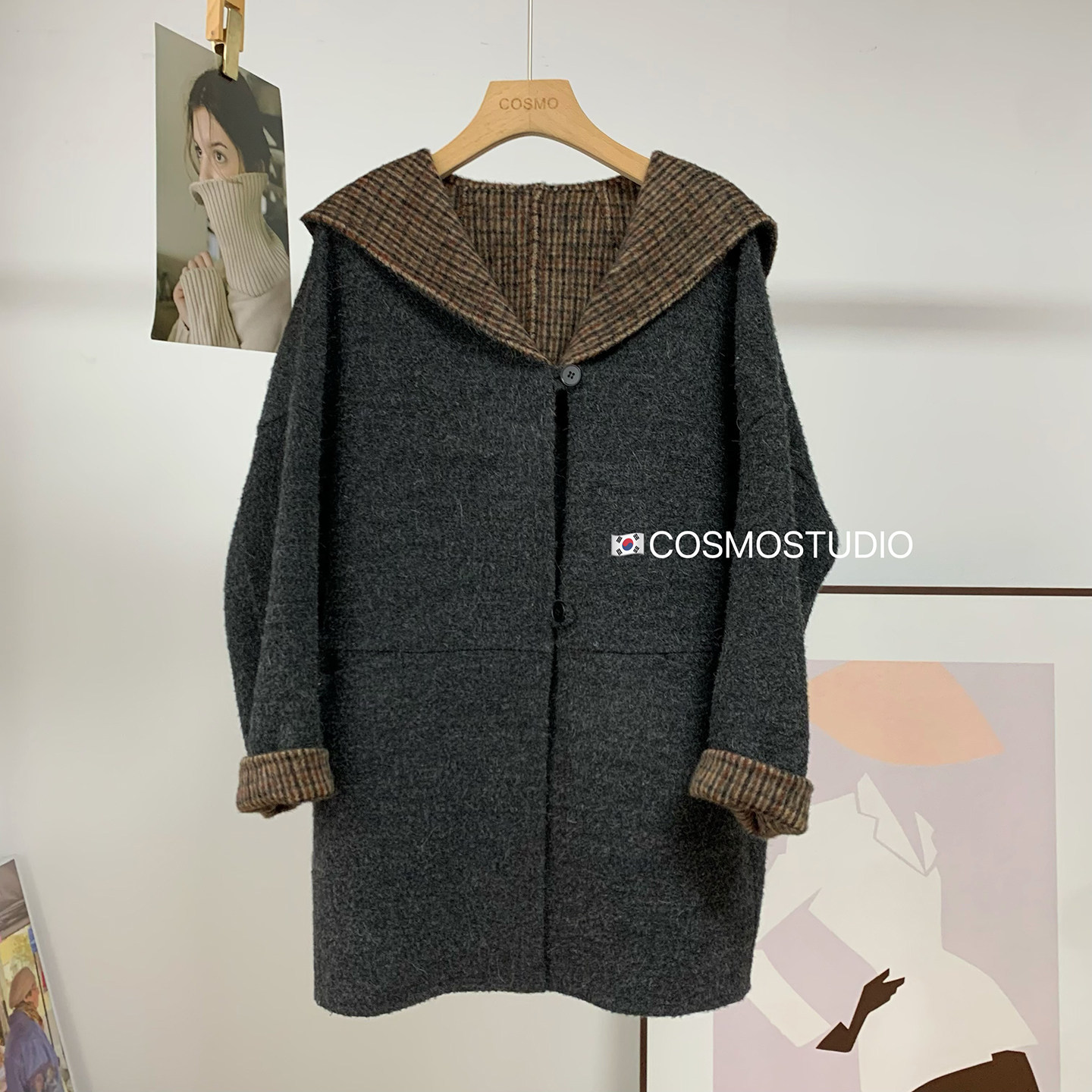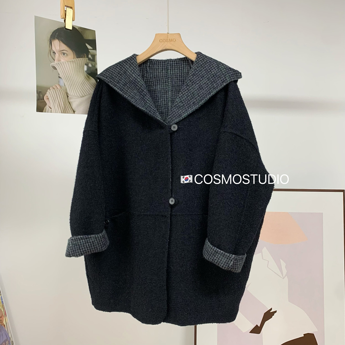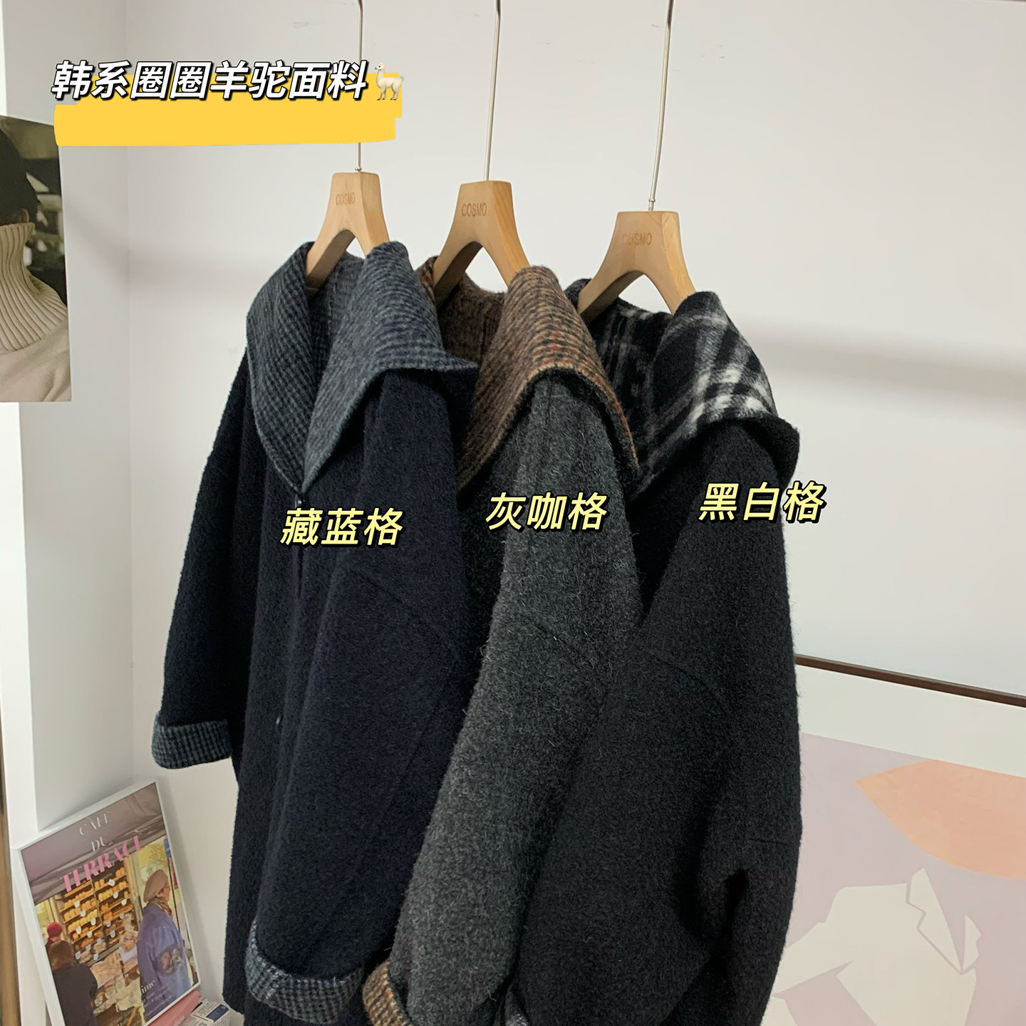 韩系大翻领连帽圈圈羊驼毛双面羊毛呢子大衣外套女中长款2025冬季