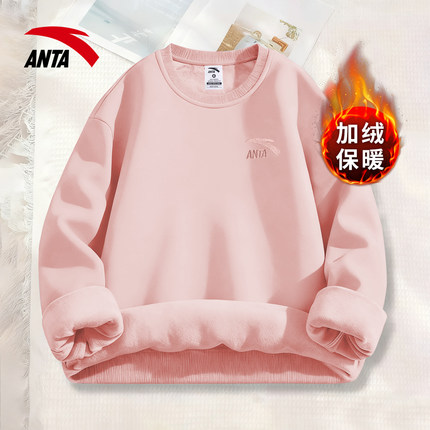 安踏圆领卫衣男女加绒加厚粉色宽松百搭长袖保暖潮流时尚运动上衣