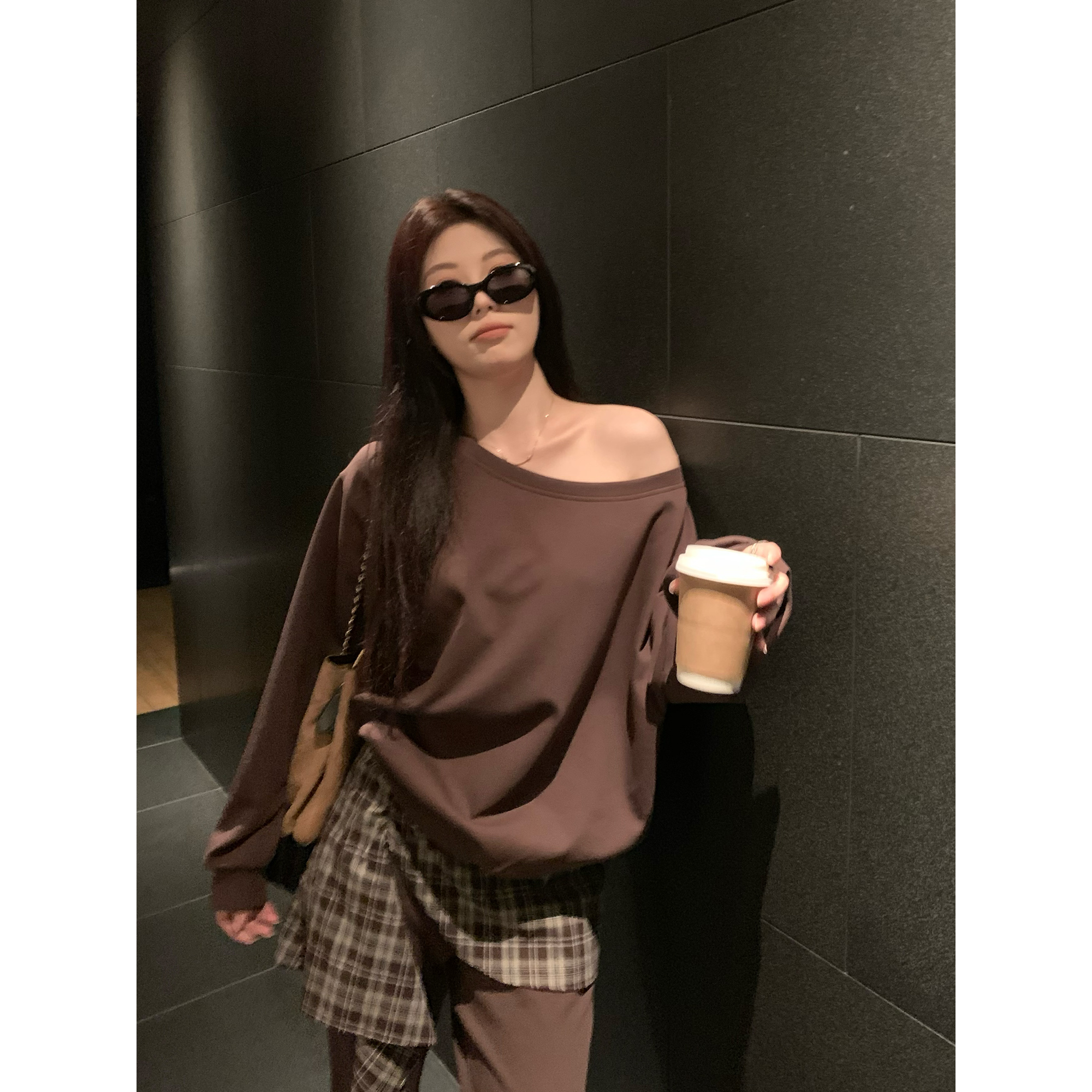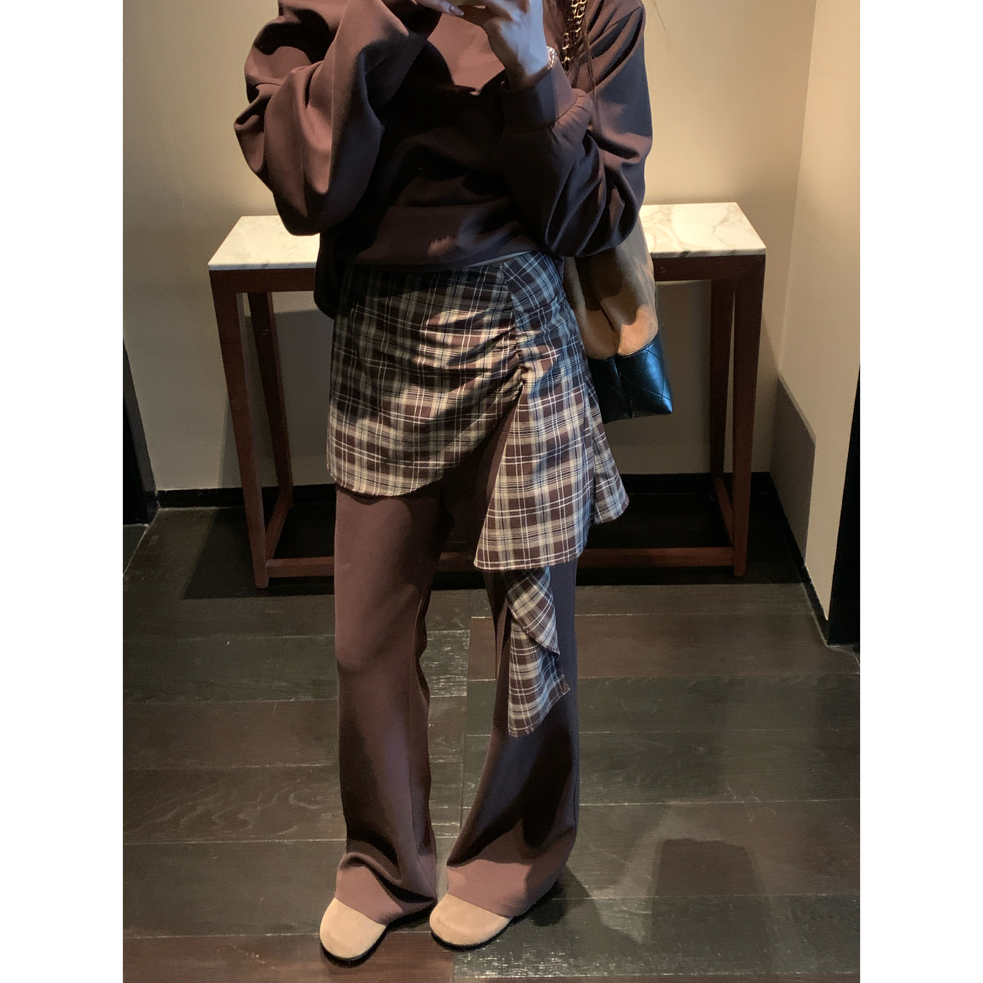 NAZ那子大码曼巴棉复古一字肩卫衣胖mm格纹拼接微喇休闲裤套装女