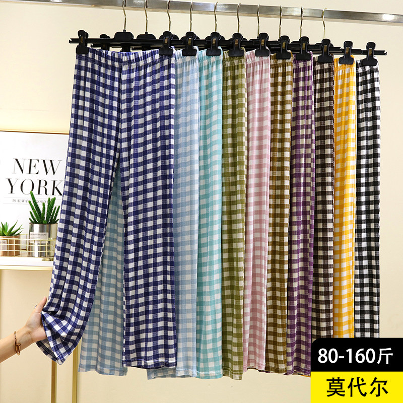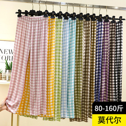 格子睡裤女夏薄款莫代尔棉居家睡裤宽松家居裤大码休闲阔腿长裤