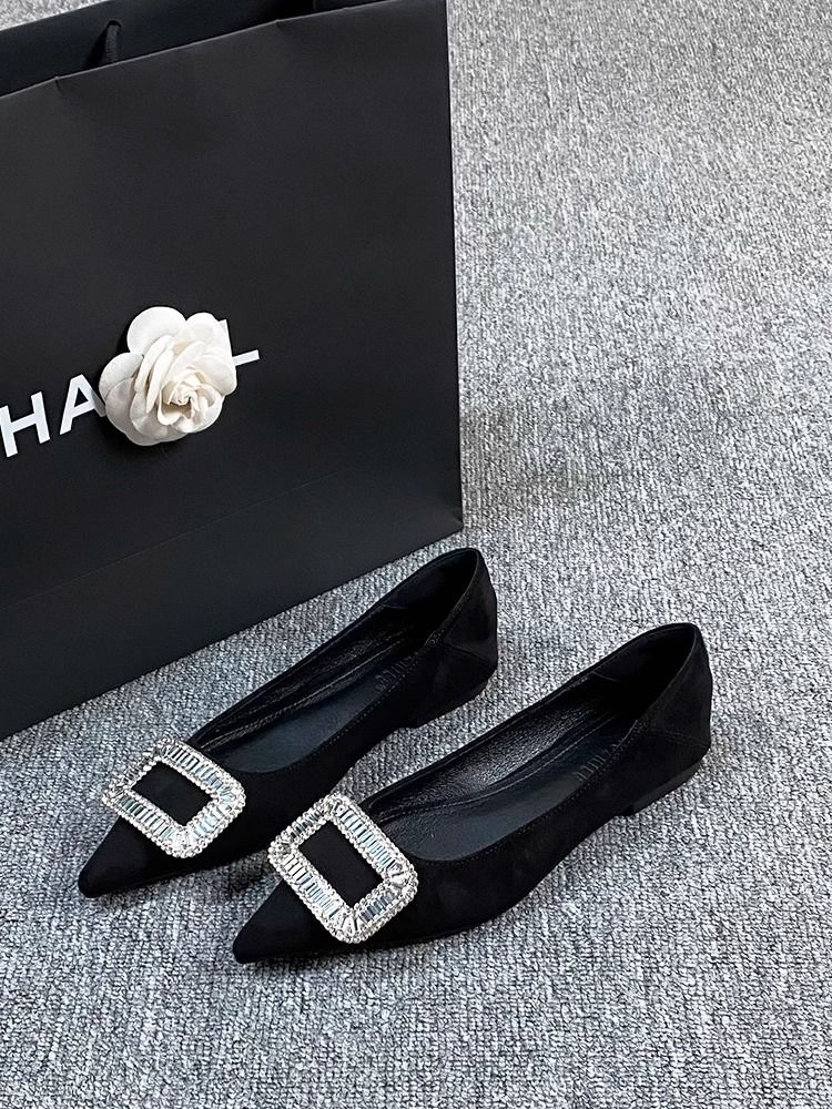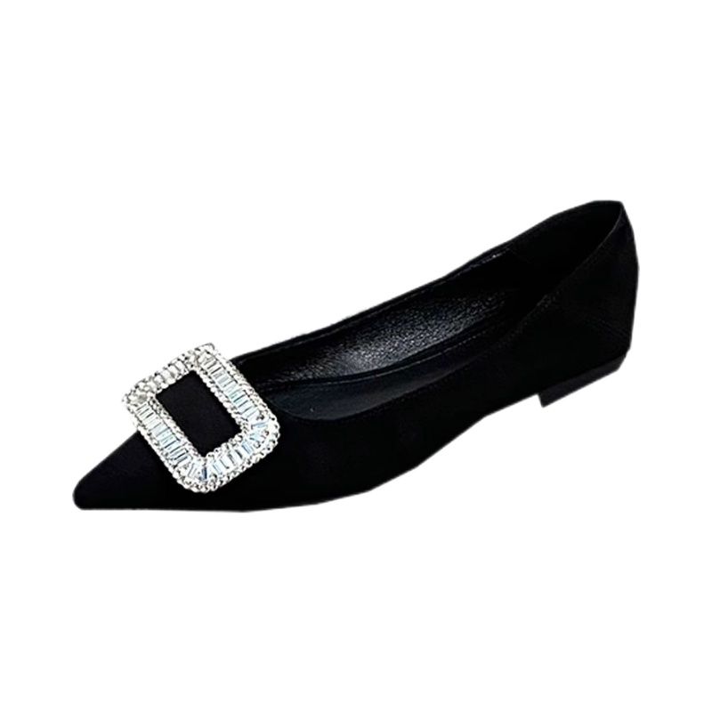 2024春秋季新款尖头气质名媛平底丝绒单鞋真皮水钻方扣软底瓢鞋女