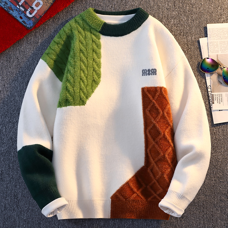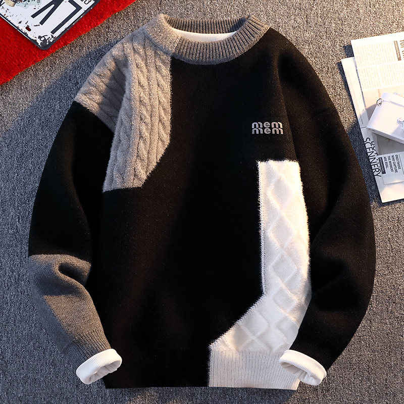 唐狮集团DESSO潮牌拼色毛衣男士加绒加厚针织衫秋冬季保暖线衣服