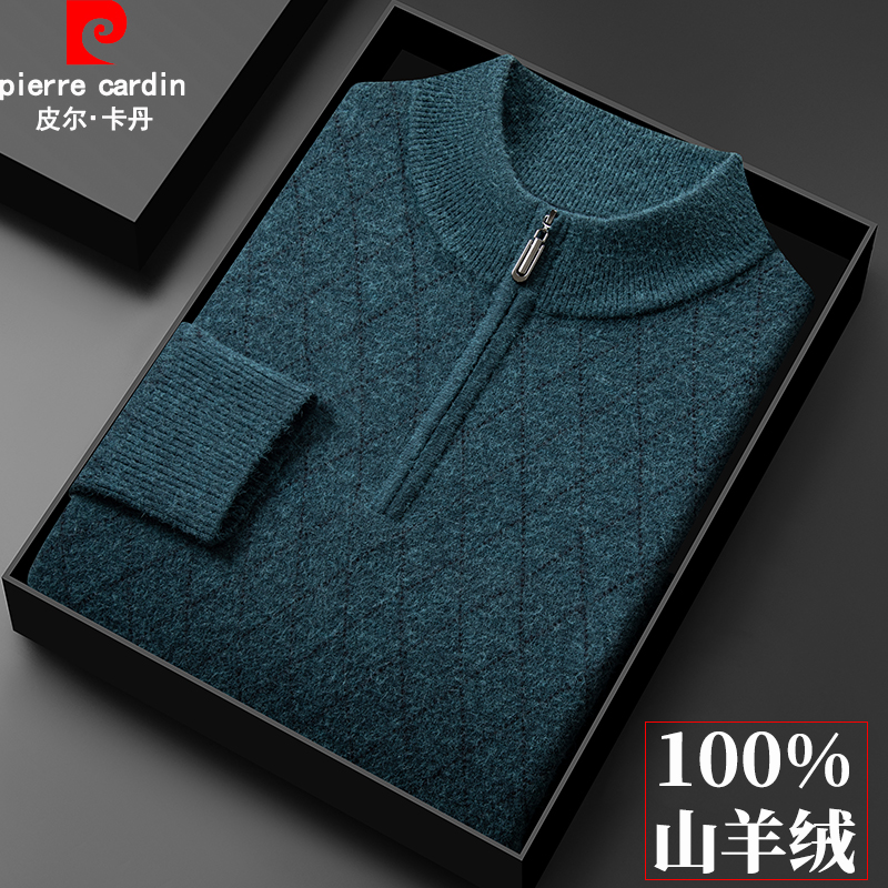 皮尔卡丹羊绒衫男半高拉链领纯羊绒加厚毛衣中老年冬季打底羊毛衫