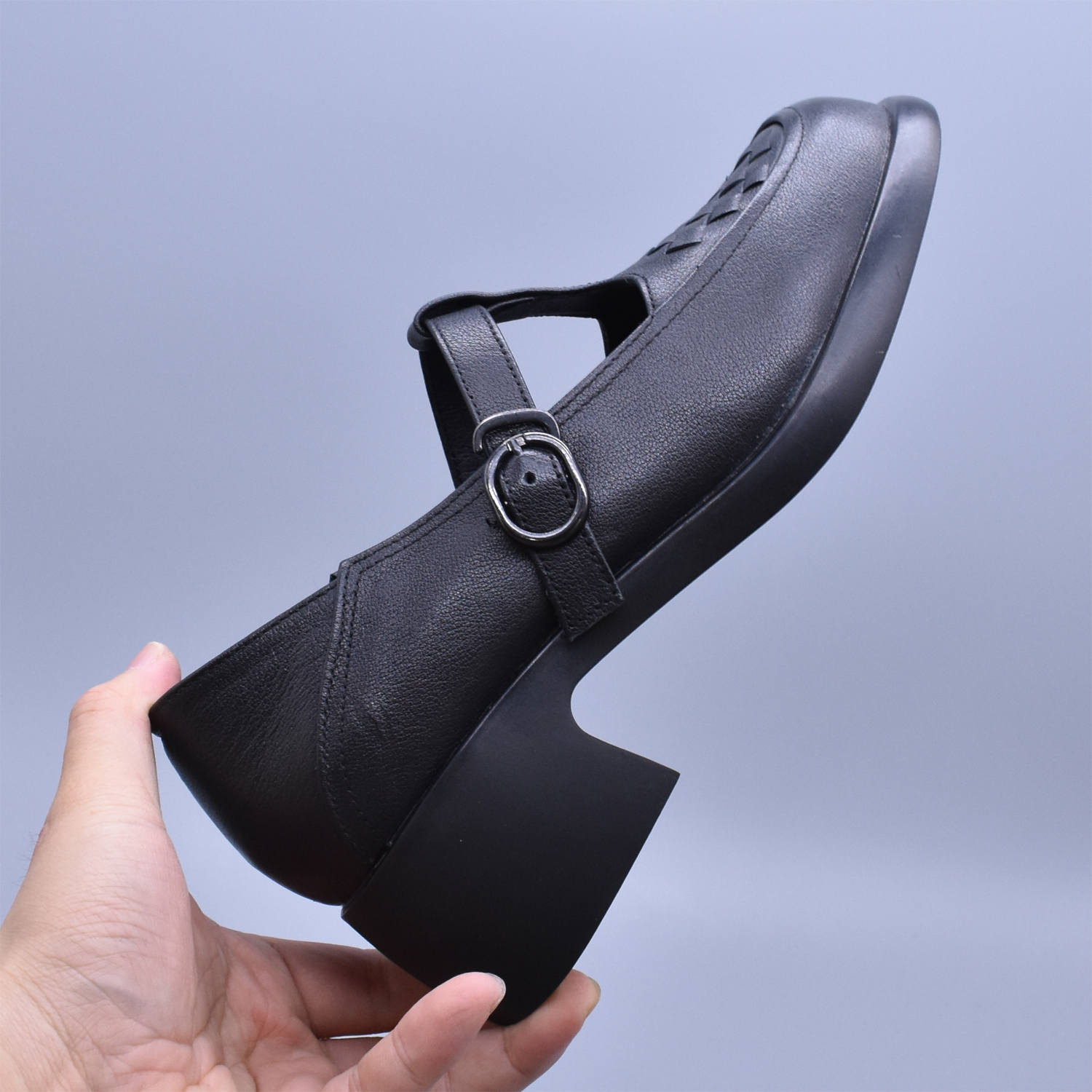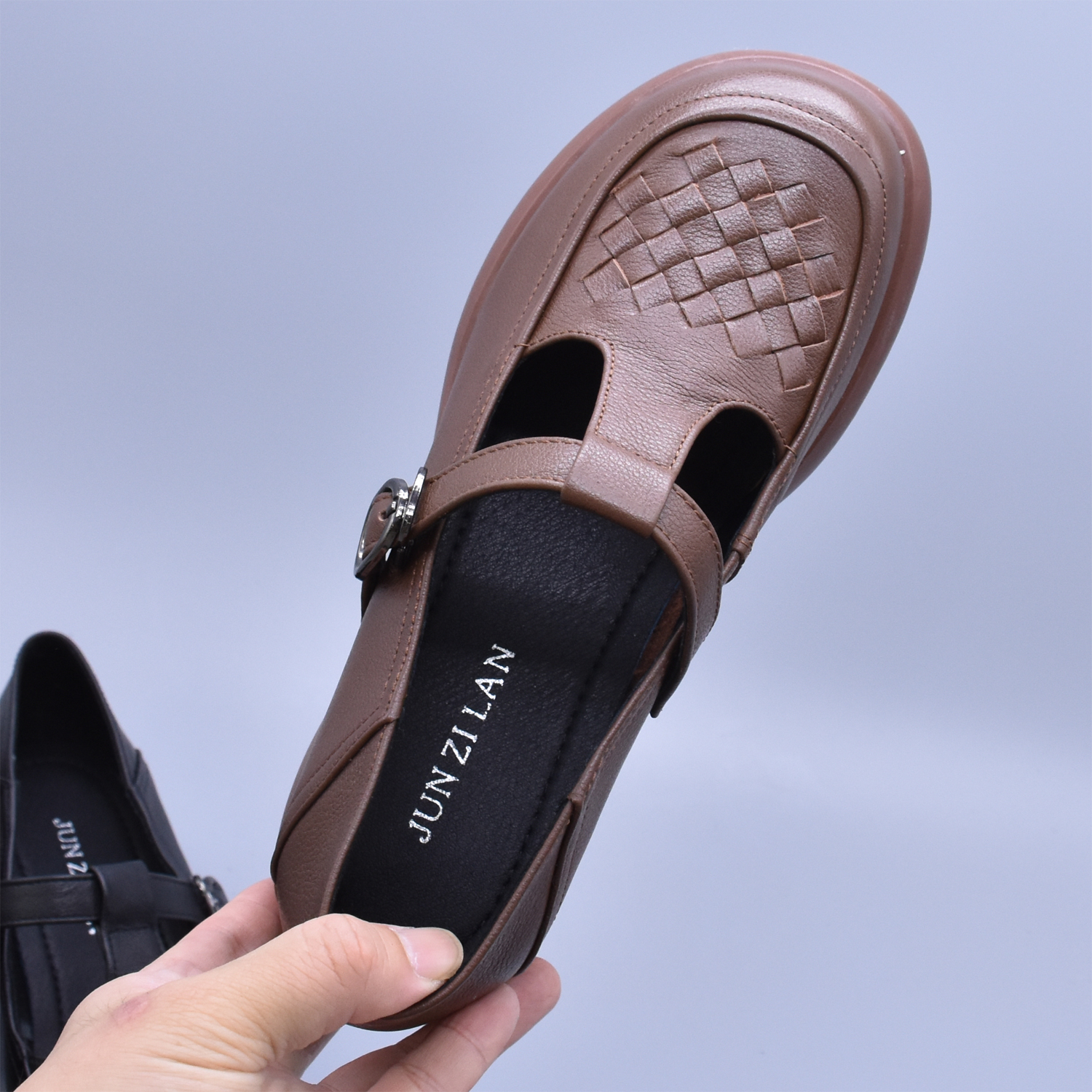 夏季编织头层牛皮粗跟软面包头玛丽珍凉鞋休闲软底罗马厚底猪笼鞋