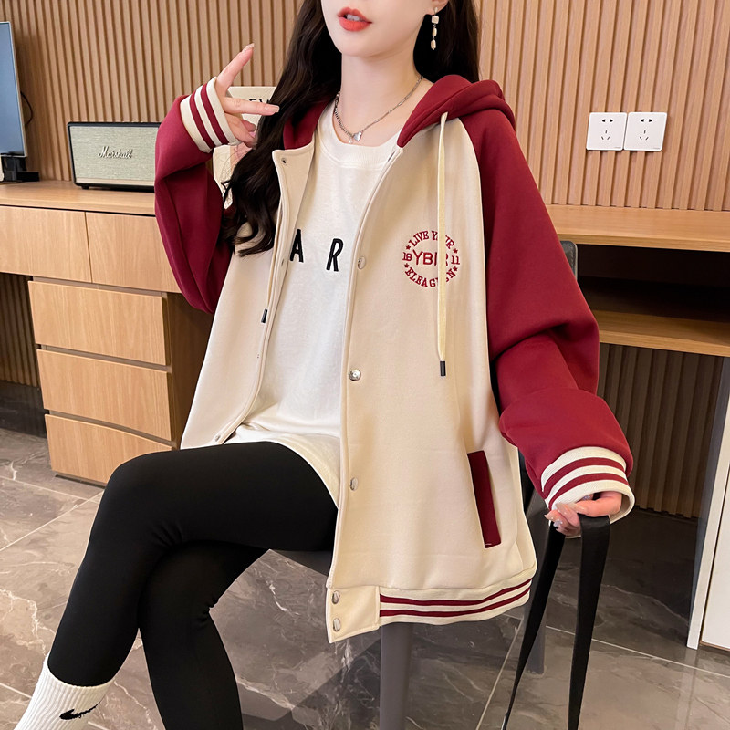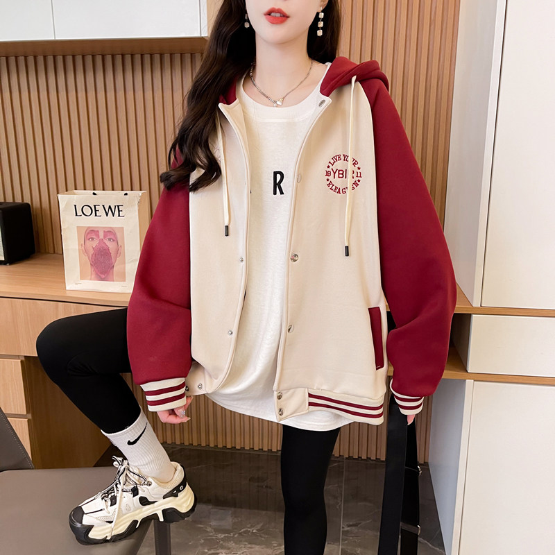 小个子红色棒球服外套女秋冬季韩版宽松大码加绒加厚撞色连帽卫衣