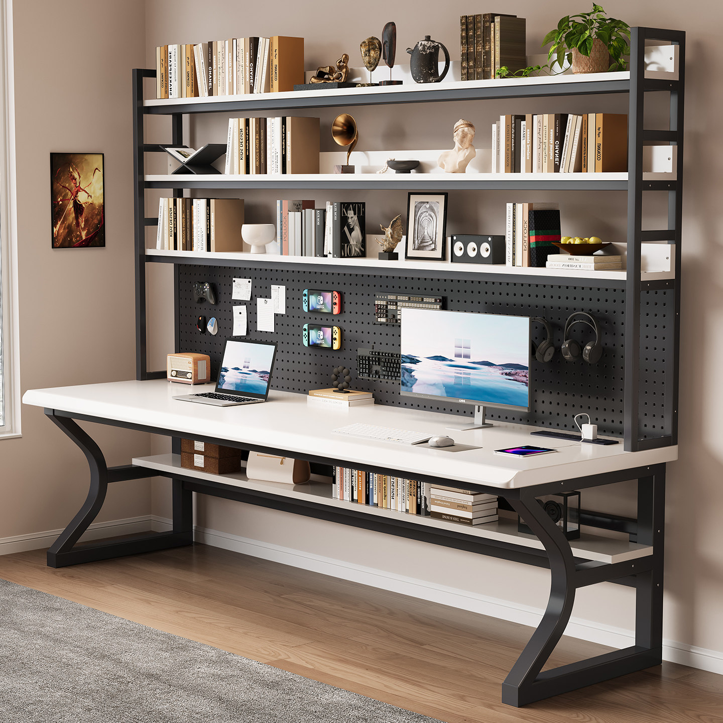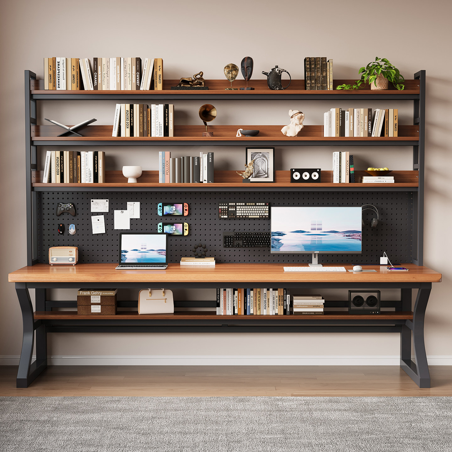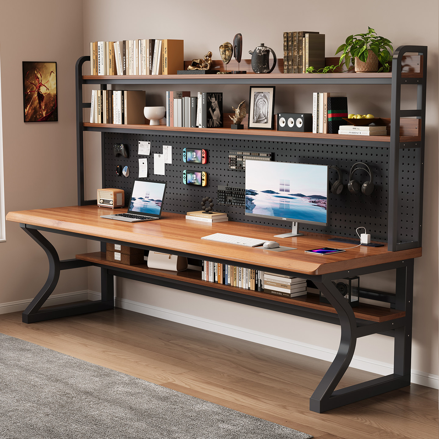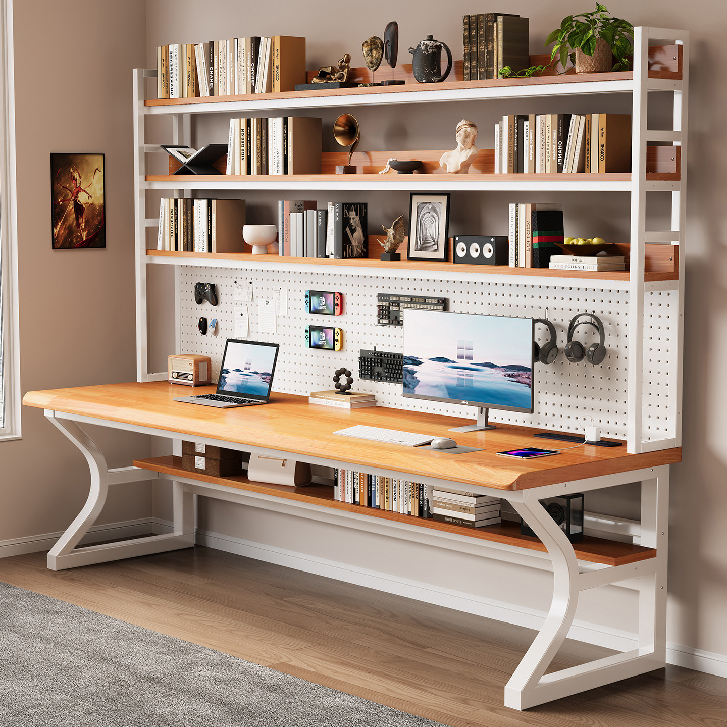 纯实木电脑桌台式家用双人学习写字办公桌洞洞板书桌书架一体桌子