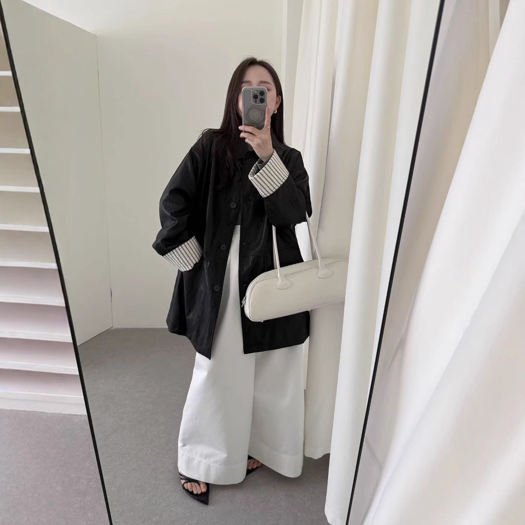 韩版中长款皮衣外套女欧洲站2025年春季新款条纹拼接复古显瘦