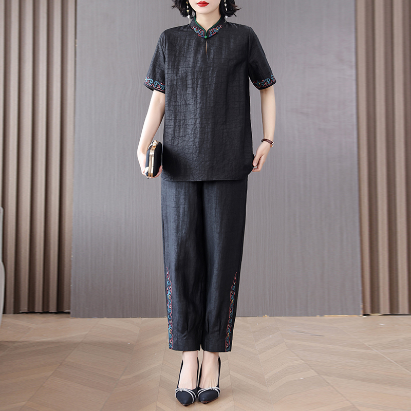 香云纱高端品牌套装2025夏季新款真丝桑蚕丝龟裂纹刺绣上衣两件套