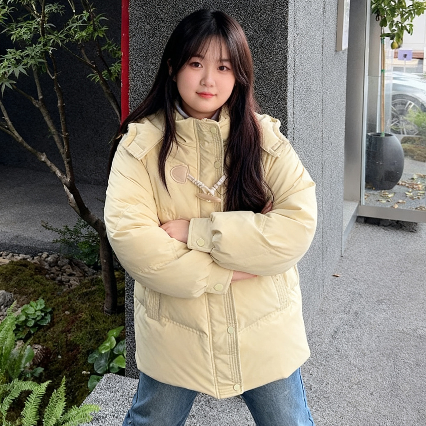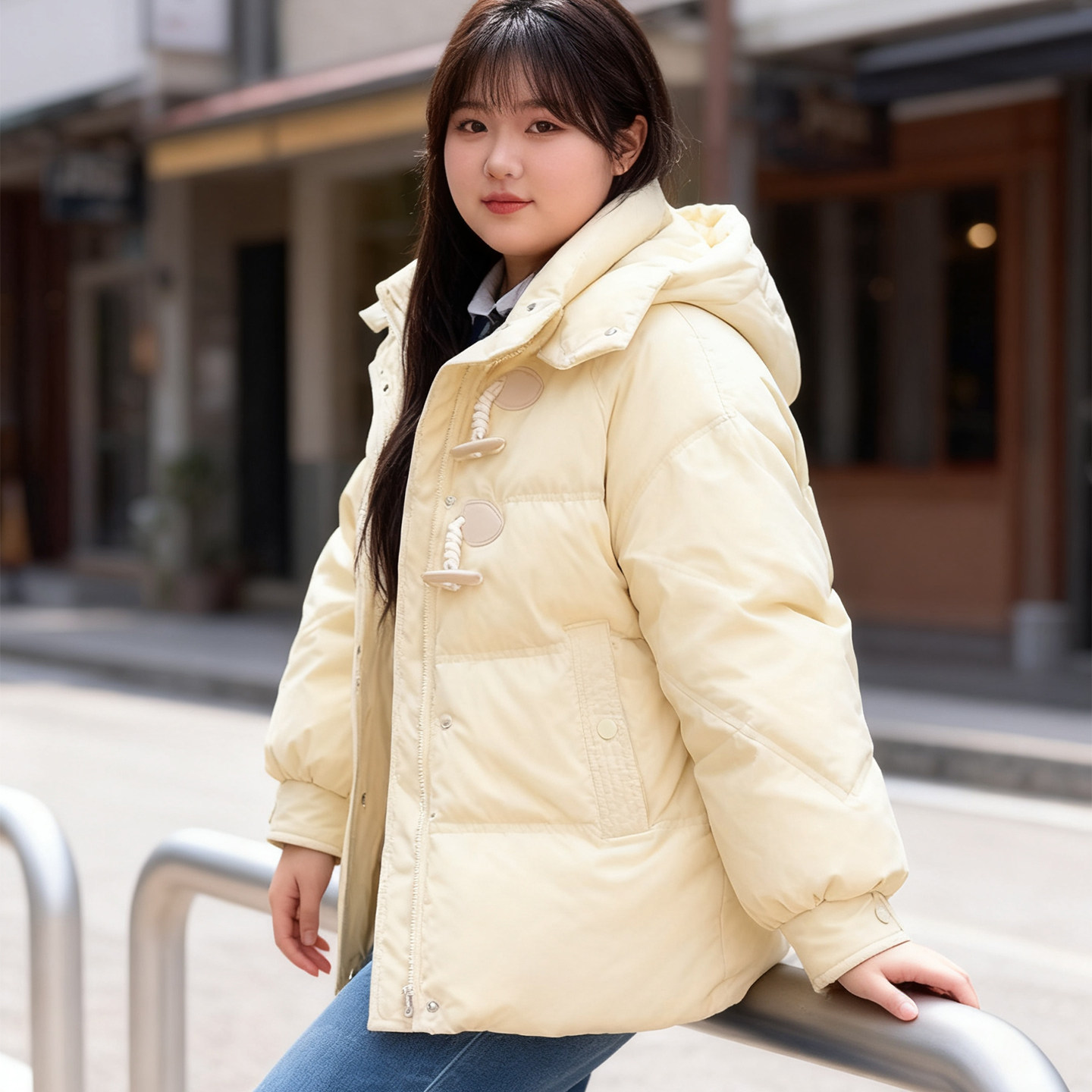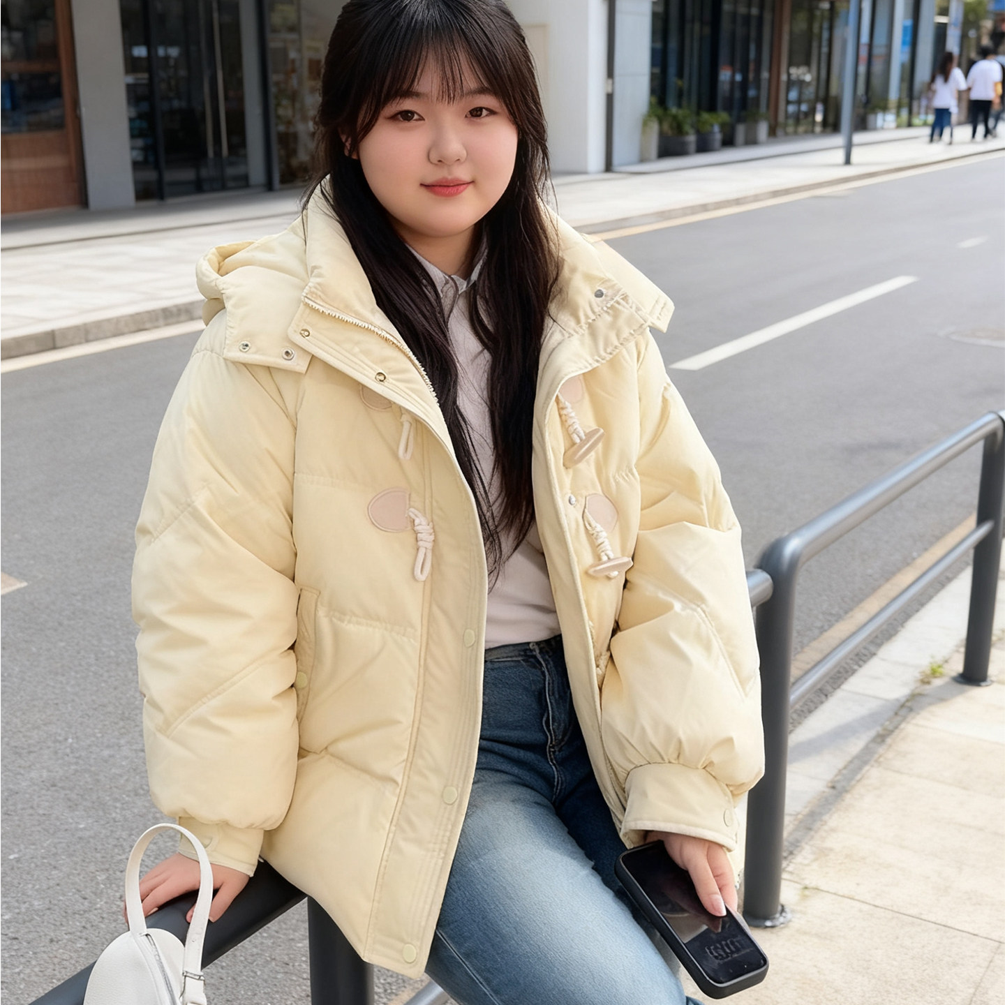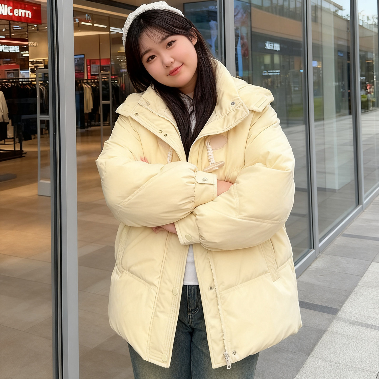 大码女装胖mm牛角扣羽绒棉服女连帽加厚保暖宽松高级感面包服外套