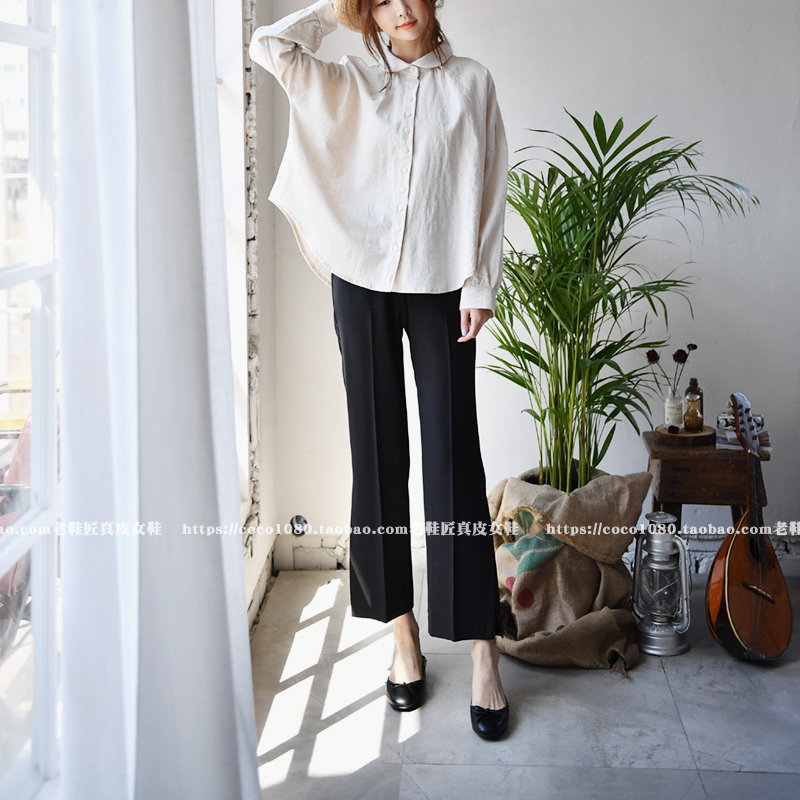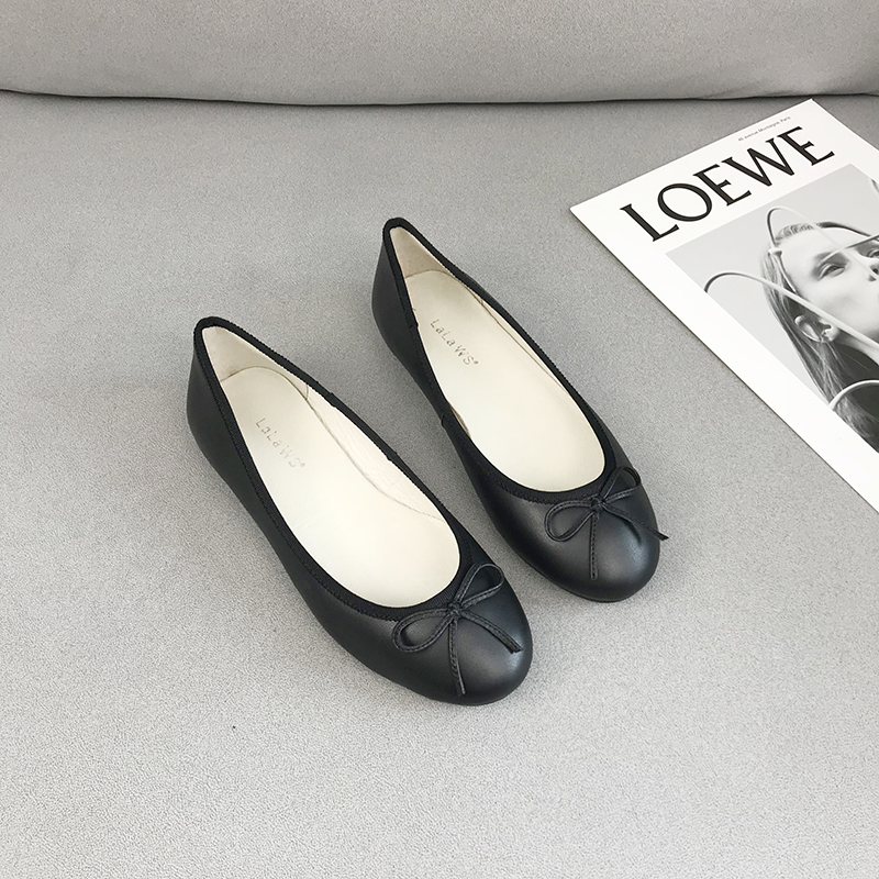 新款软牛皮圆头浅口平底单鞋真皮百搭蝴蝶结芭蕾舞奶奶鞋船鞋春季