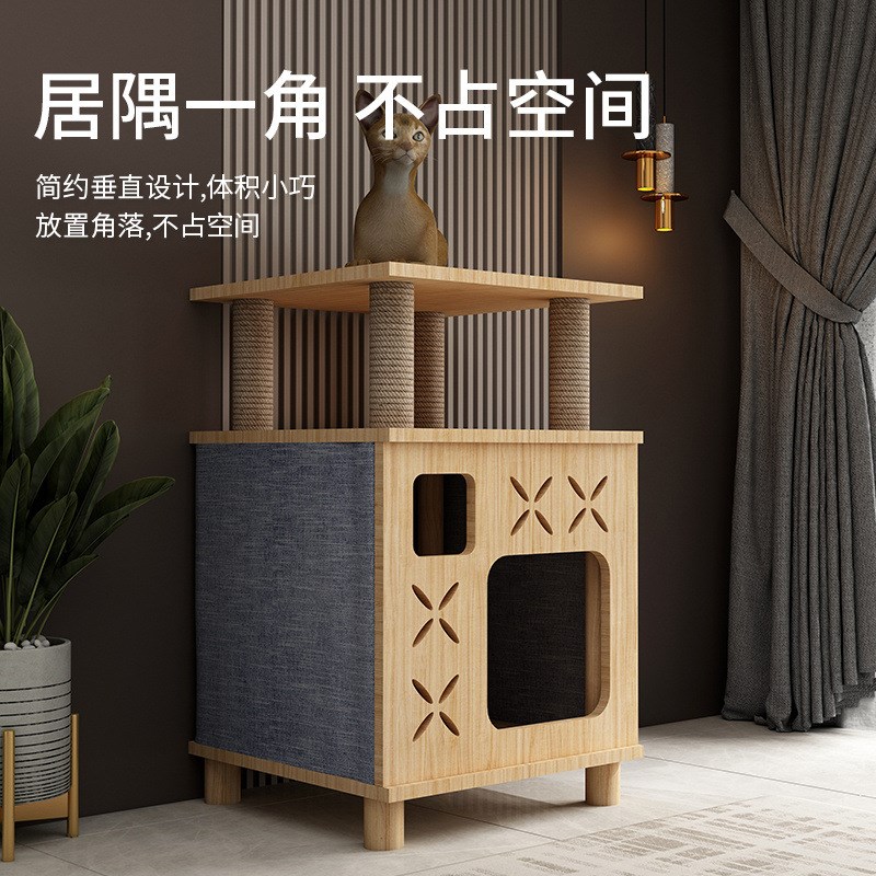 宠物窝实木四季通用猫别墅封闭式狗窝猫爬架床头柜人猫咪共用凳子