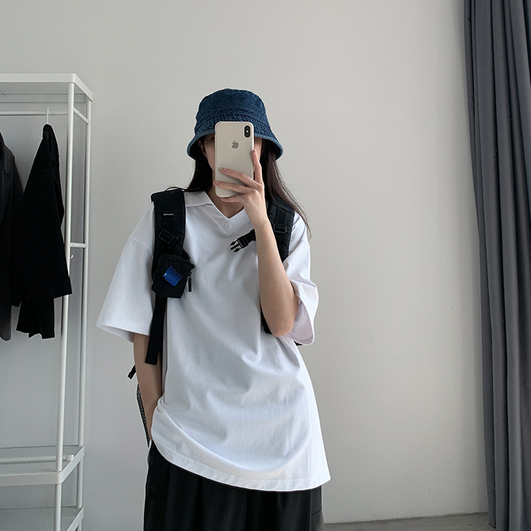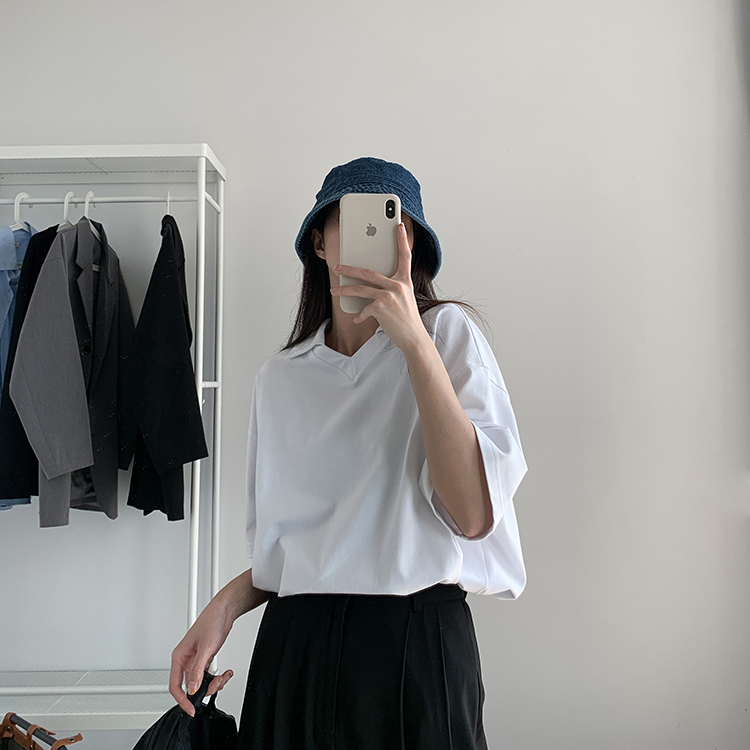 纯白色短袖t恤女夏季宽松简约打底韩版polo衫翻领衫v领棉质上衣潮