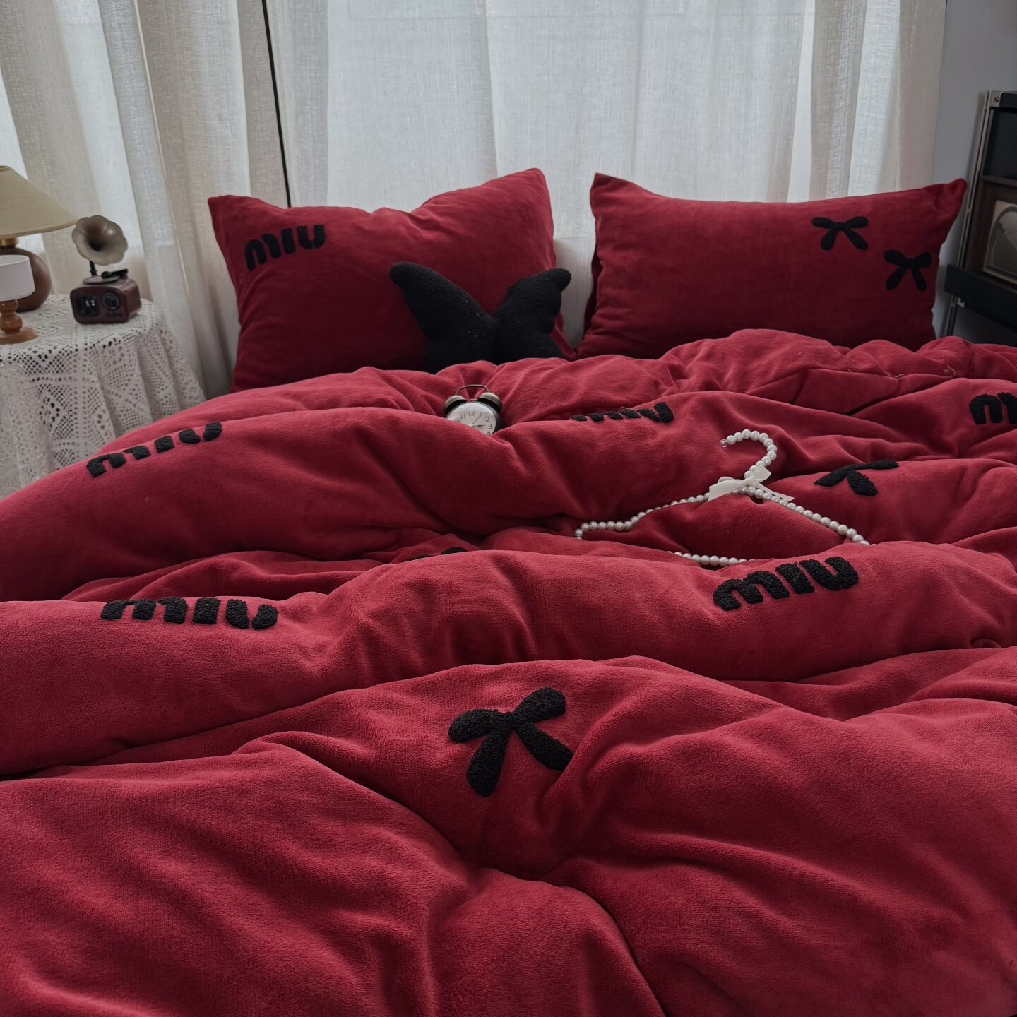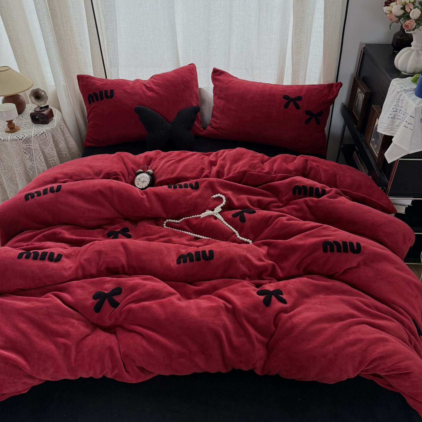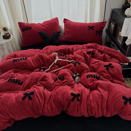 冬季少女红色蝴蝶结毛巾绣牛奶绒四件套双面珊瑚绒被套床单三件套