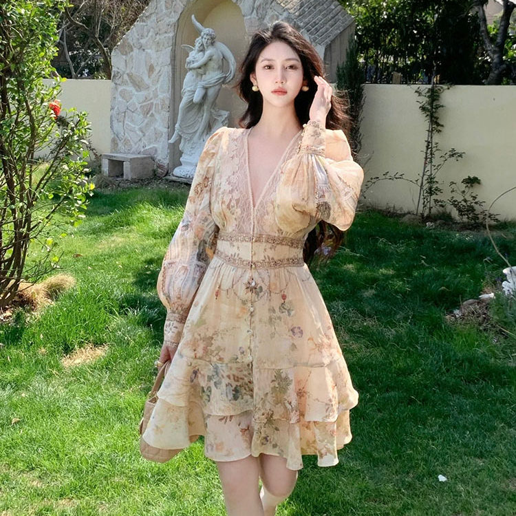 澳洲Cam*lla2025新款气质宫廷风蕾丝花卉印花V领真丝麻长款连衣裙