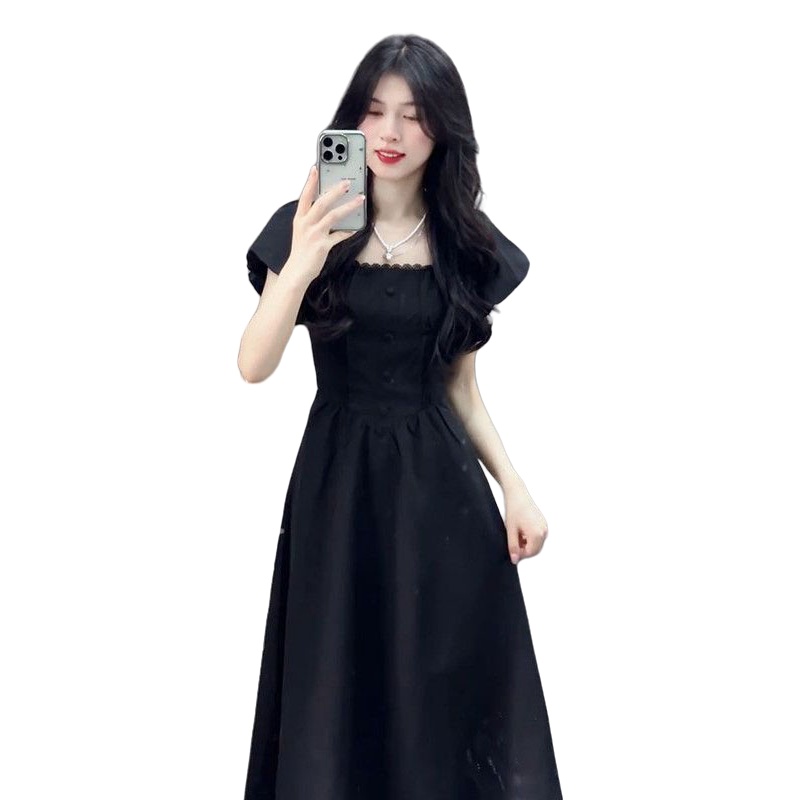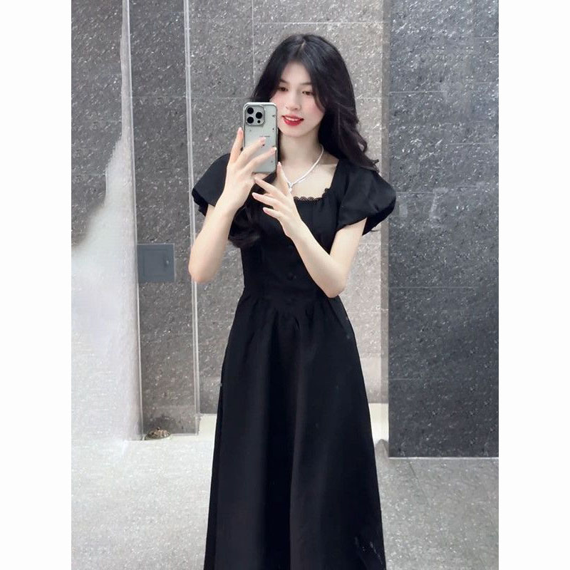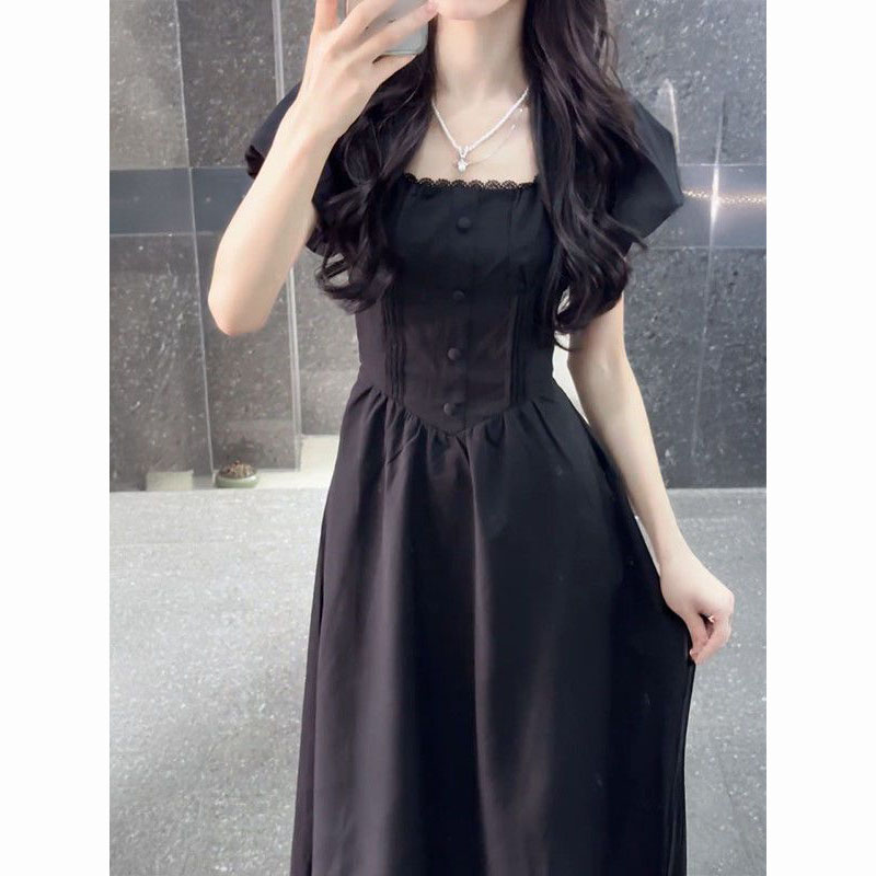 2025法式气质赫本淑女风黑色方口领泡泡袖连衣裙收腰显瘦别致长裙