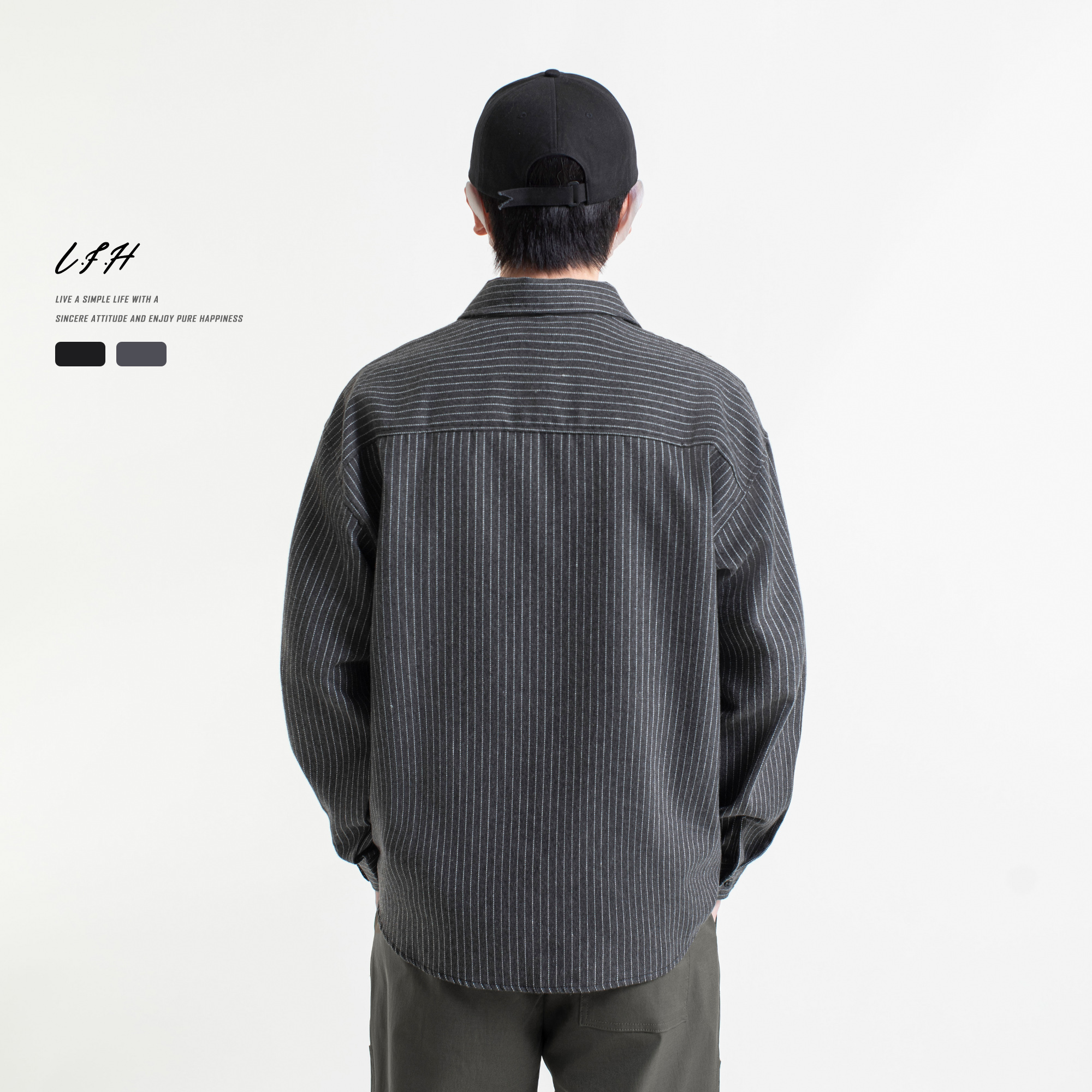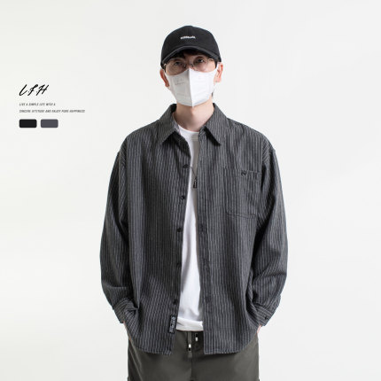 写意 秋季新款日系复古条纹男长袖衬衫宽松休闲磨毛男生内搭衬衣