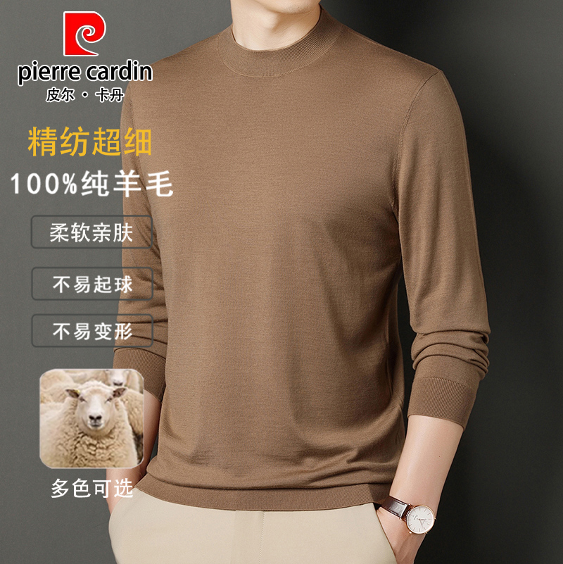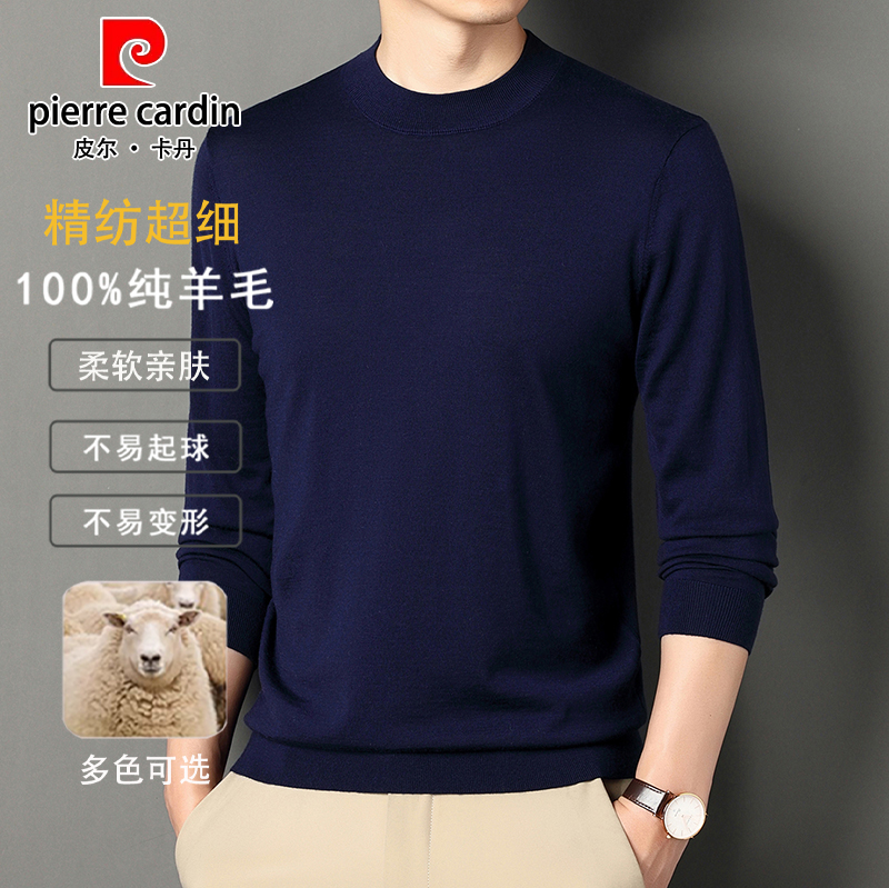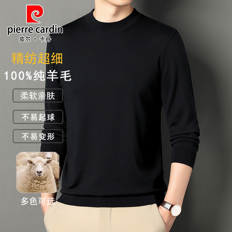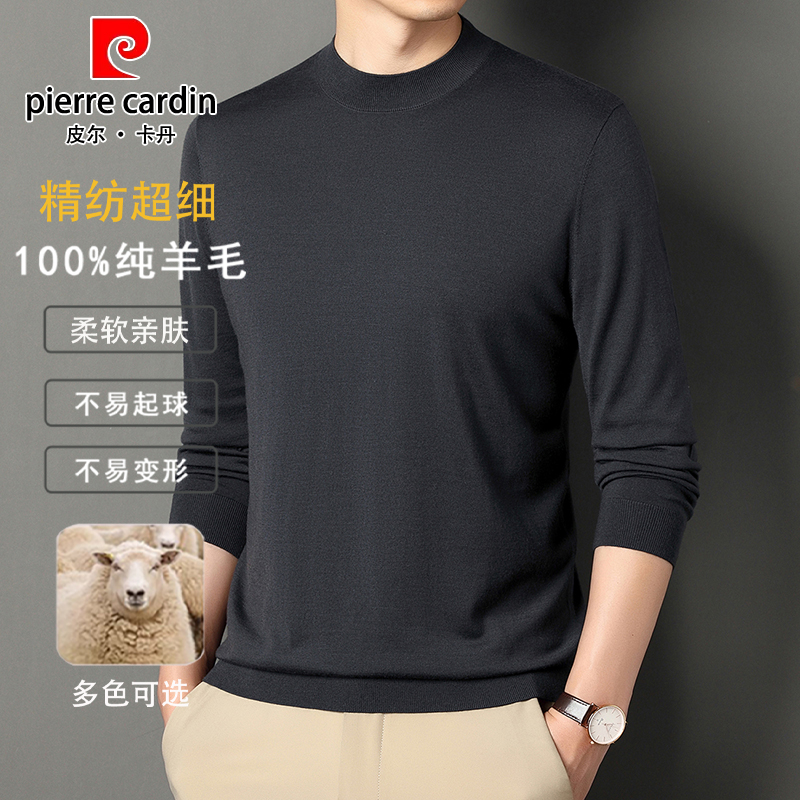 皮尔卡丹秋冬薄款精纺纯羊毛衫男士半高领纯色毛衣长袖针织打底衫