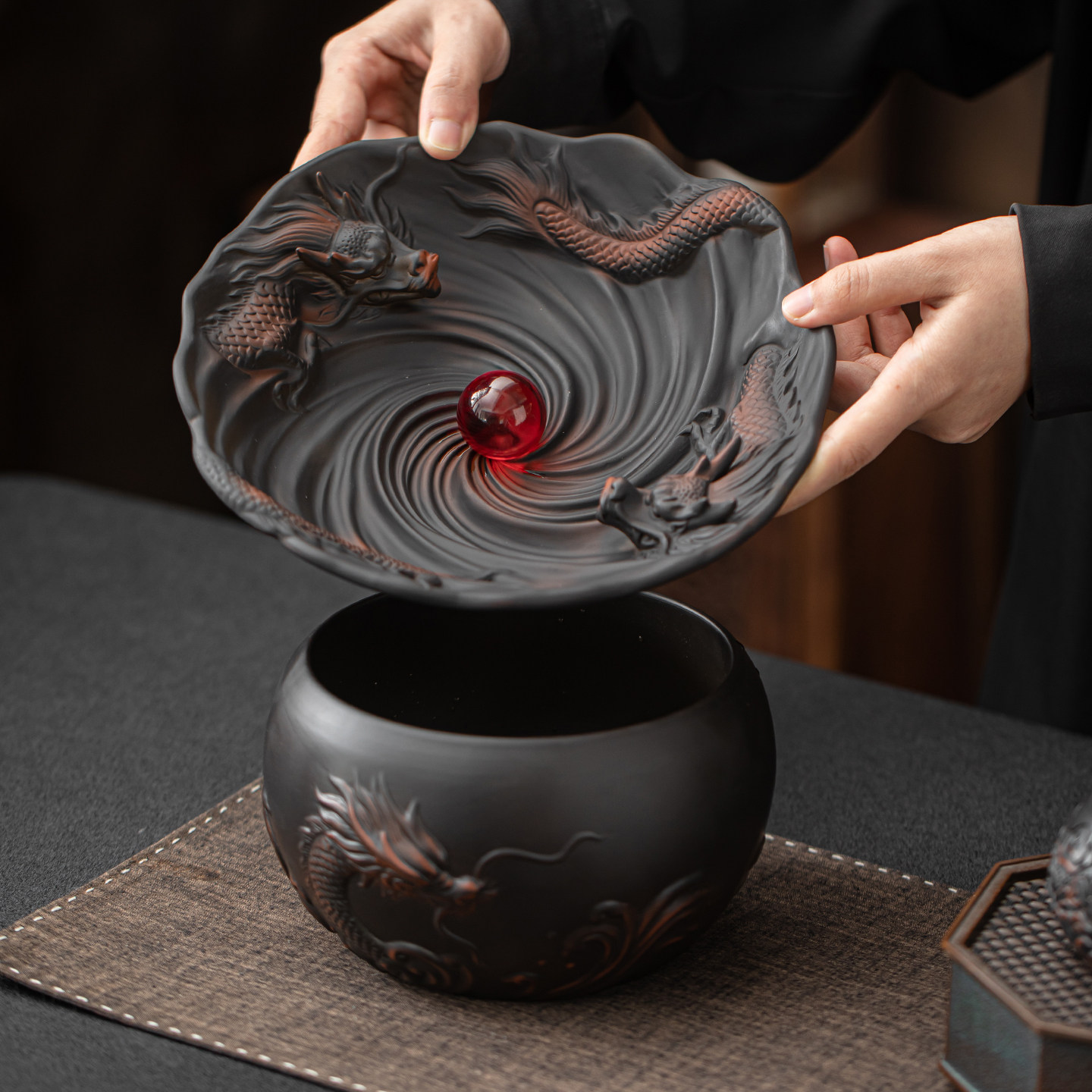 紫陶家用客厅茶渣缸茶洗陶瓷大号复古带盖过滤水盂建水茶具配件