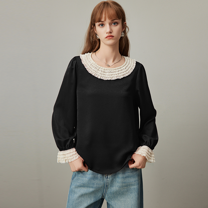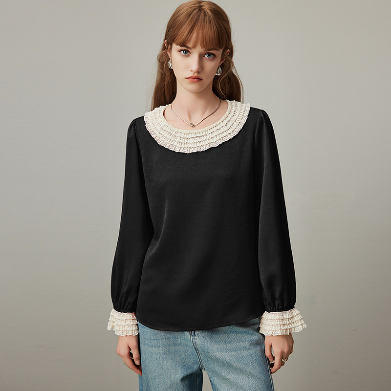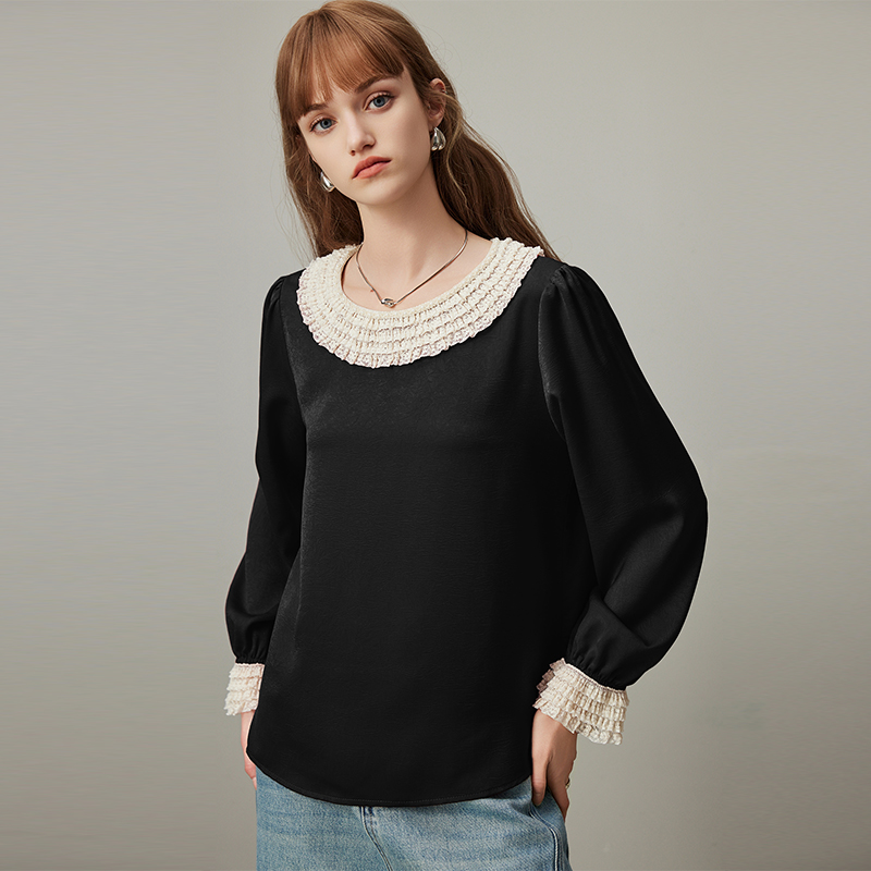 dfvc黑色洋气长袖衬衫女2025年秋季新款蕾丝拼接薄款宽松圆领小衫