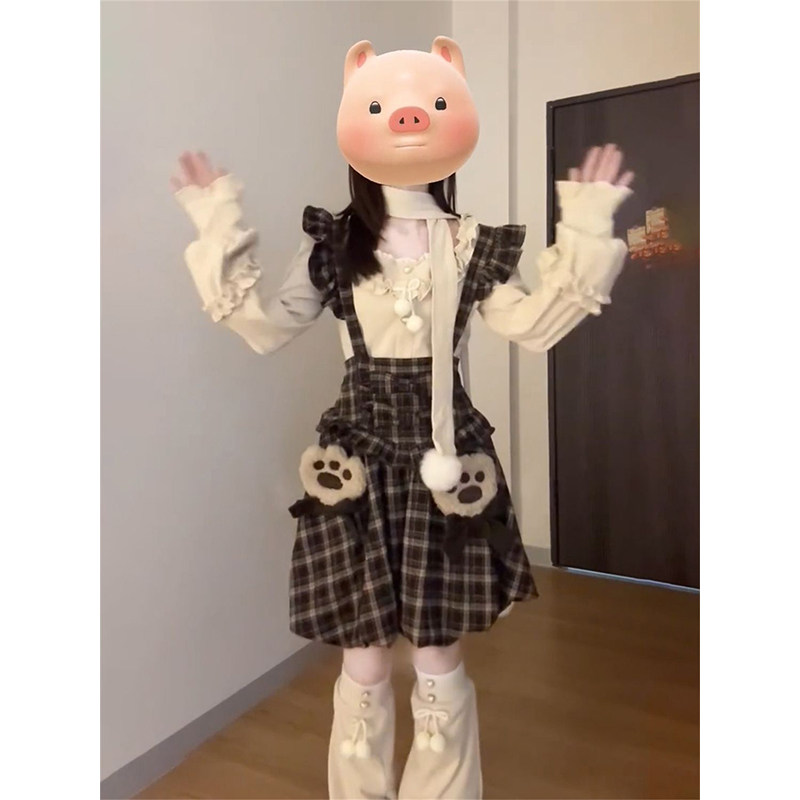 小众独特可爱学院风花苞背带连衣裙叠穿方口领木耳边上衣两件套装