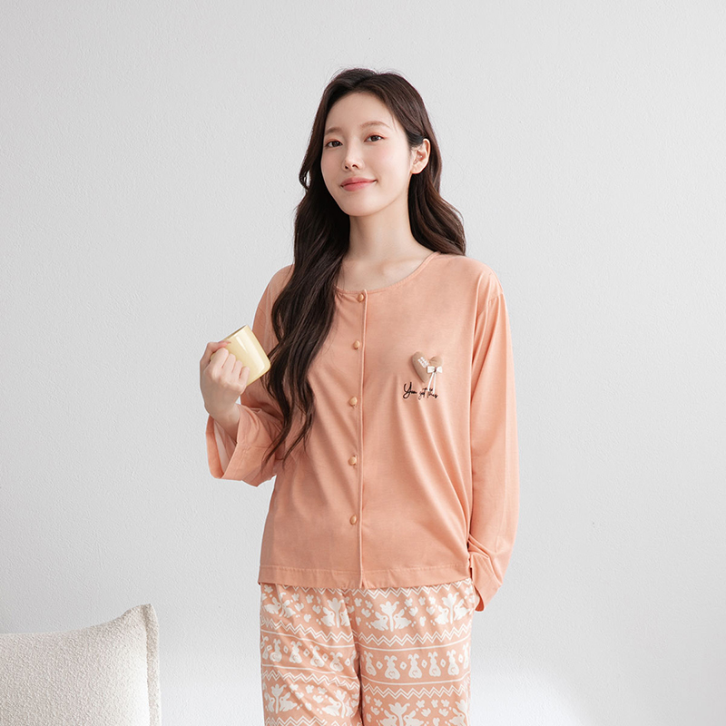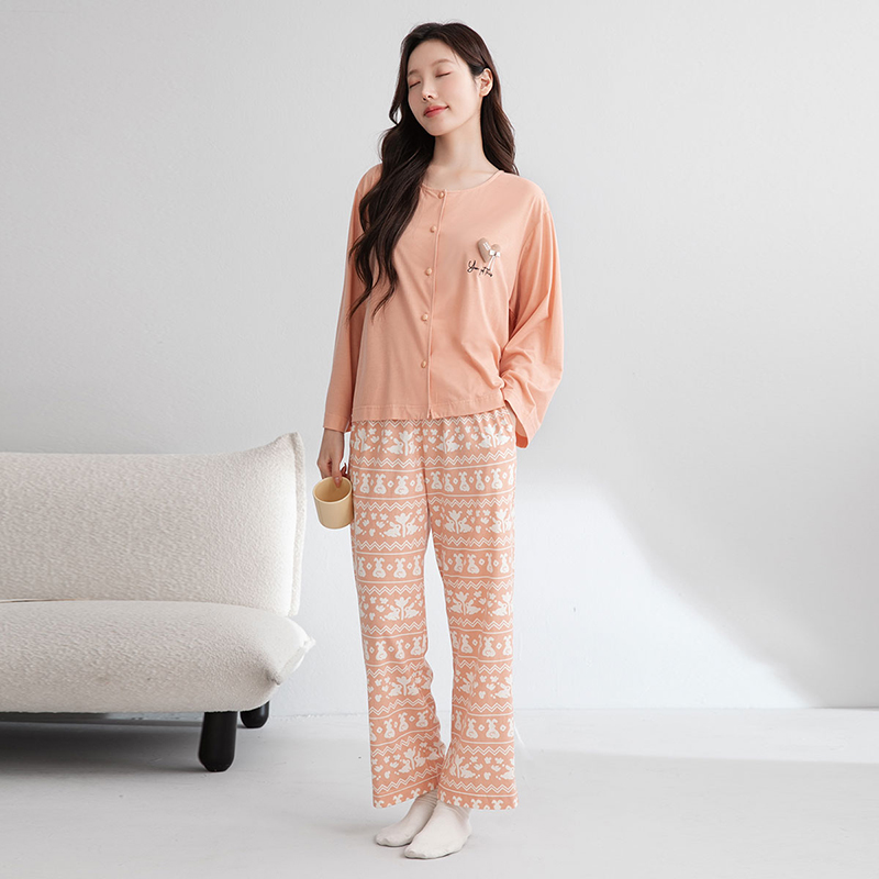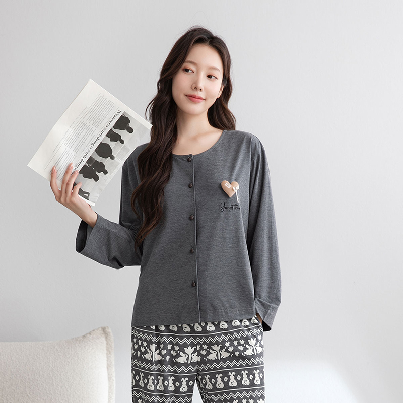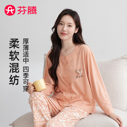 芬腾2025秋季新款弹力柔软睡衣套装圆领长袖开衫复古长裤家居服女