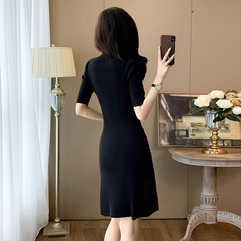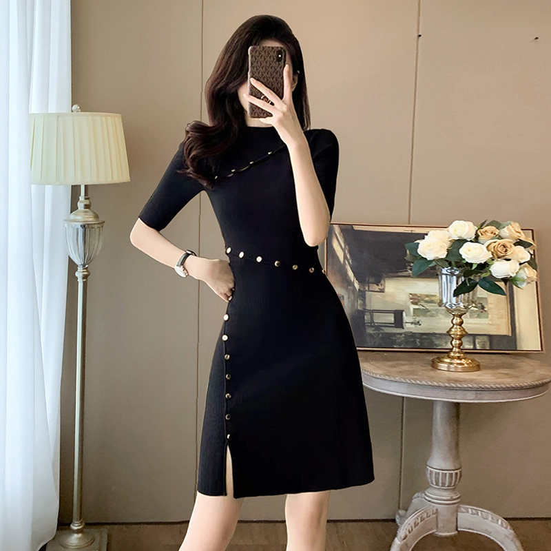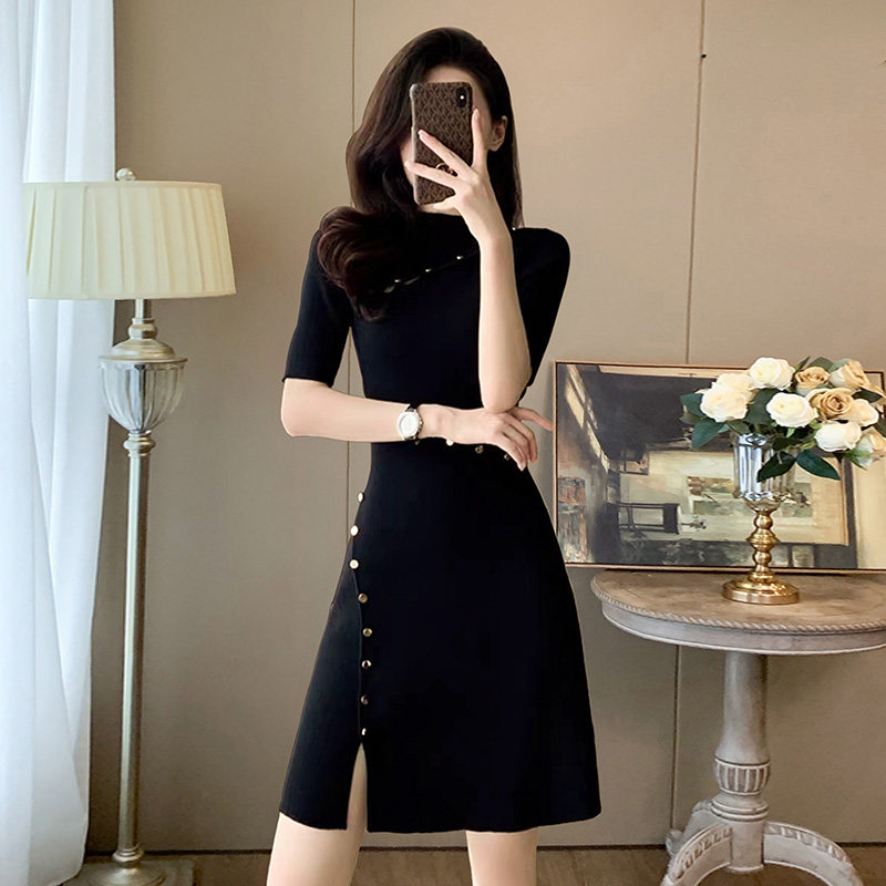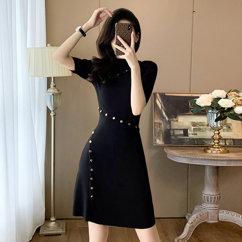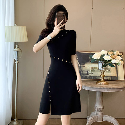 小香风冰丝针织连衣裙女夏季新款高级感修身OL通勤赫本风小黑裙
