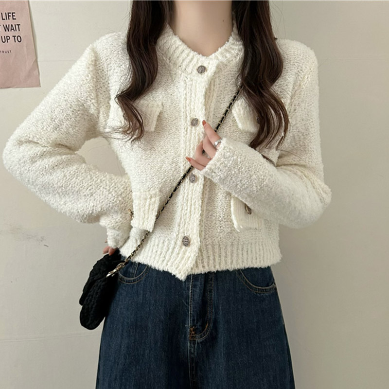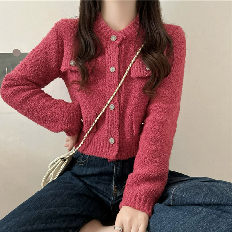 玫红色小香风针织开衫女早秋穿搭短款高腰大朗毛衣外套小个子上衣