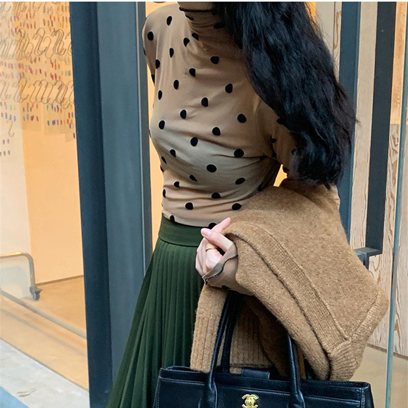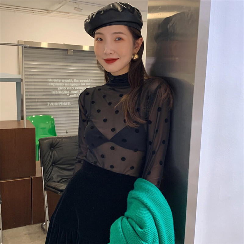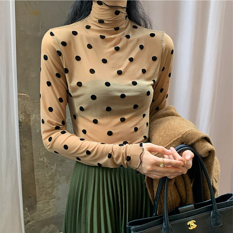 欧洲站2021冬季新款女装时尚波点微透打底衫百搭修身高领网纱T恤