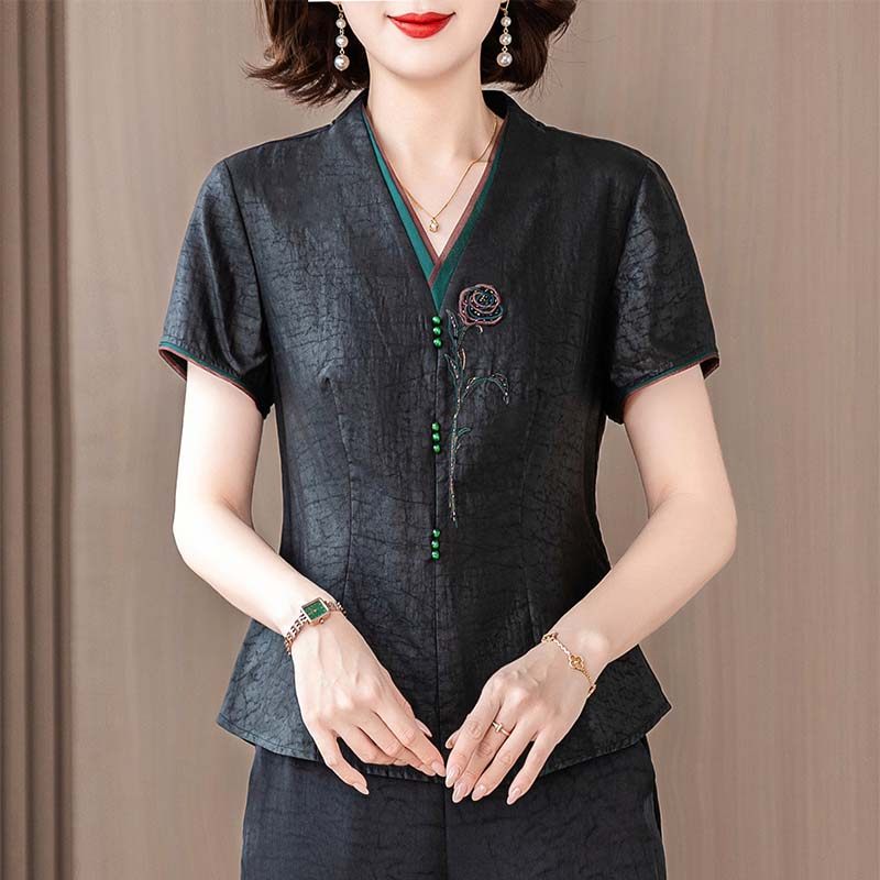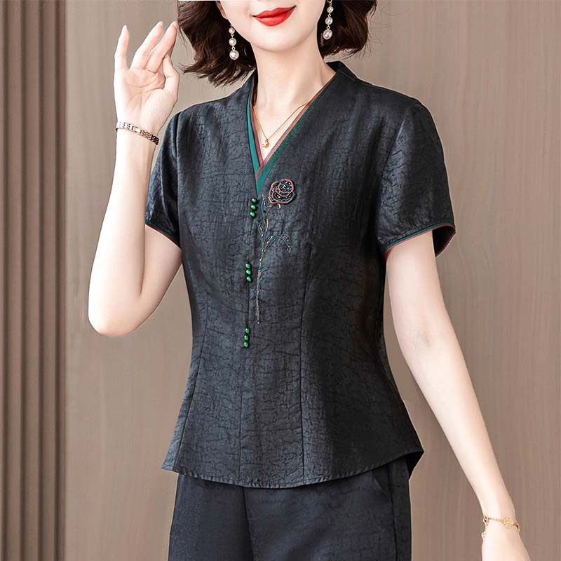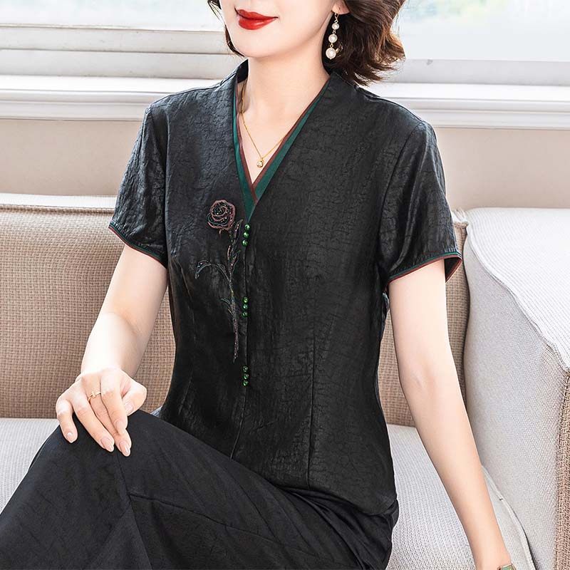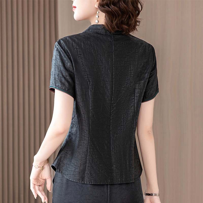 新中式香云纱真丝套头衬衫女中年妈妈夏季新款桑蚕丝T恤短袖上衣t