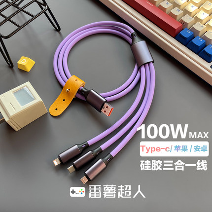 Type-c数据线三合一硅胶充电线一拖三100W超级快充100W适用于苹果华为vivo小米oppo荣耀安卓车载手机6A机客线