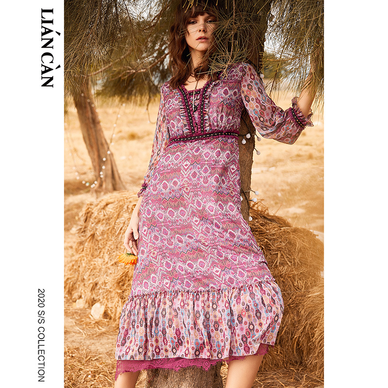 莲灿新中式年气质收腰多巴胺优雅织带印花长裙连衣裙7120224005